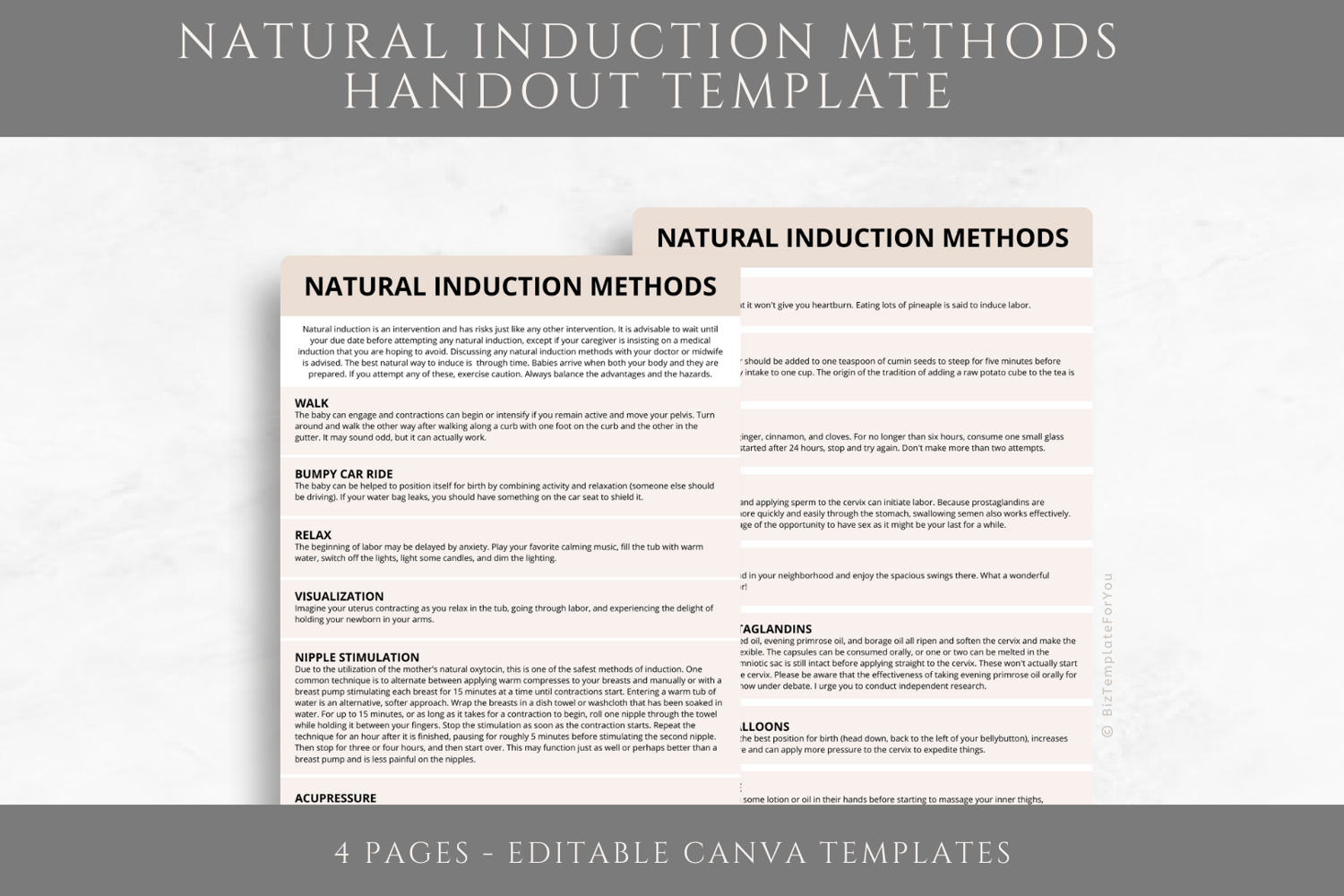 Editable Natural Induction Methods Handout Template, Doula Tool, Birth Education, Labor and Delivery Resource, Labor Process Handout, Canva editable #2001
