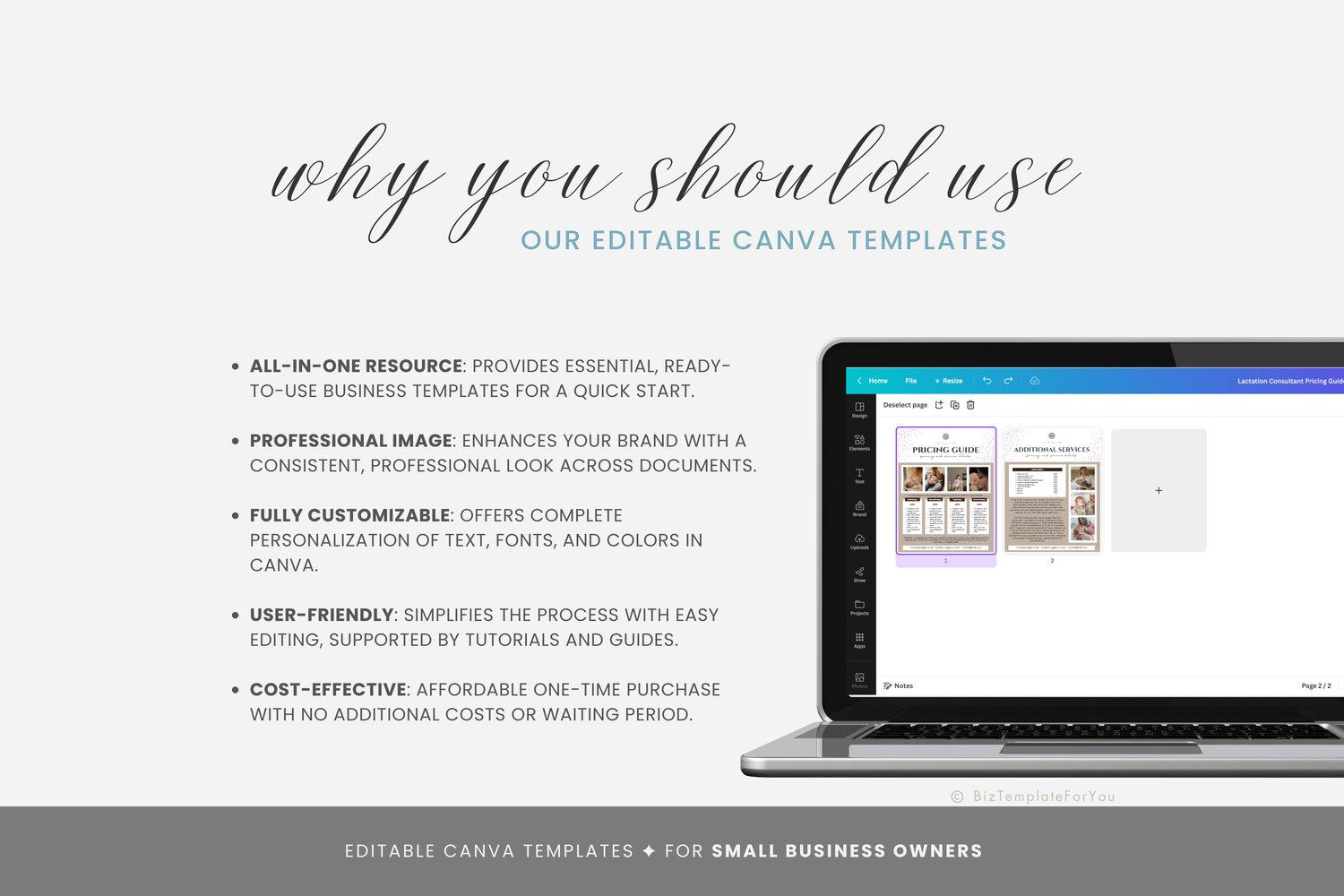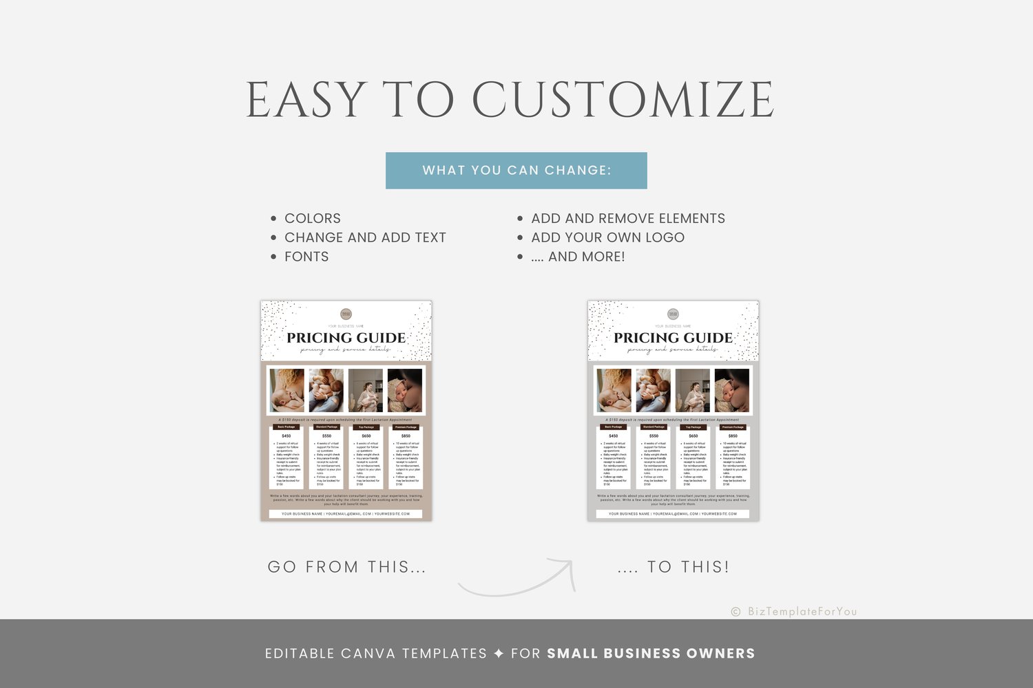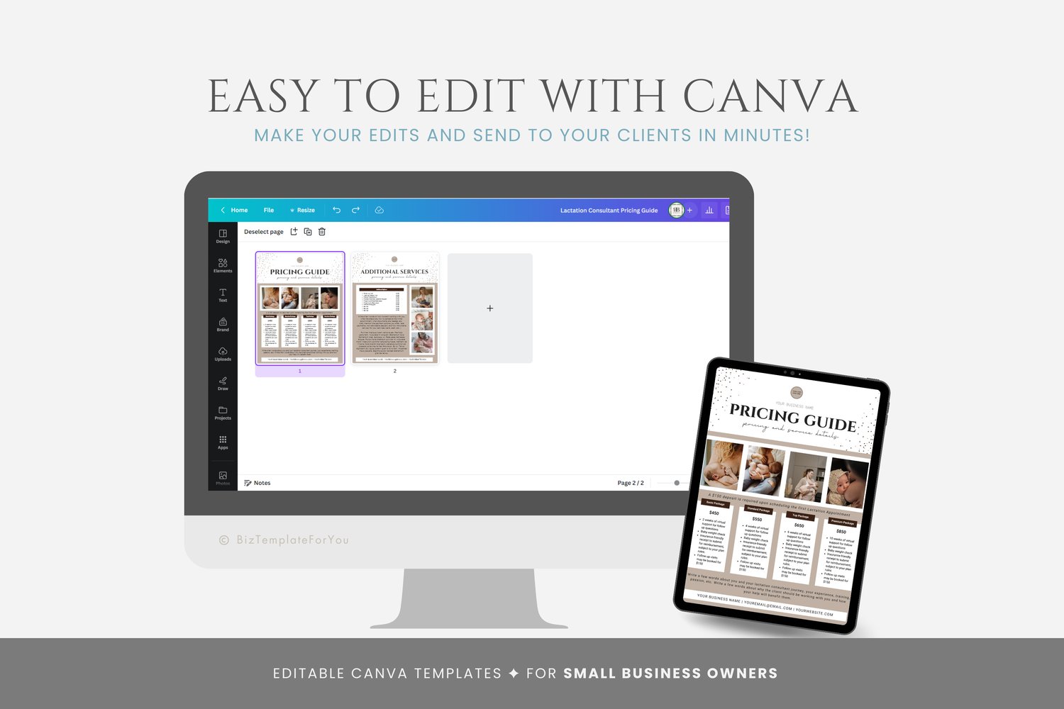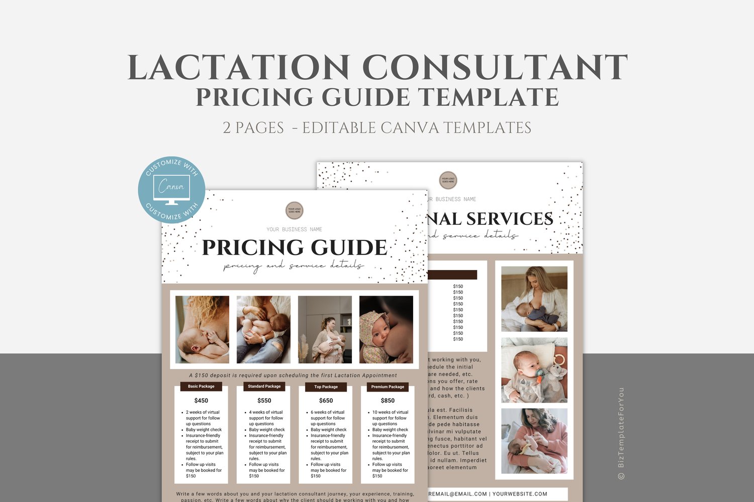 This is a 2-page Lactation Consultant Price List Template editable in Canva (FREE Account)! The text is already written for you, but it can also be easily edited in CANVA to add anything particular to your business or area. It is also completely customizable. Text, font, and colors are all fully editable to give you complete control of your branding and create a cohesive look for your business.