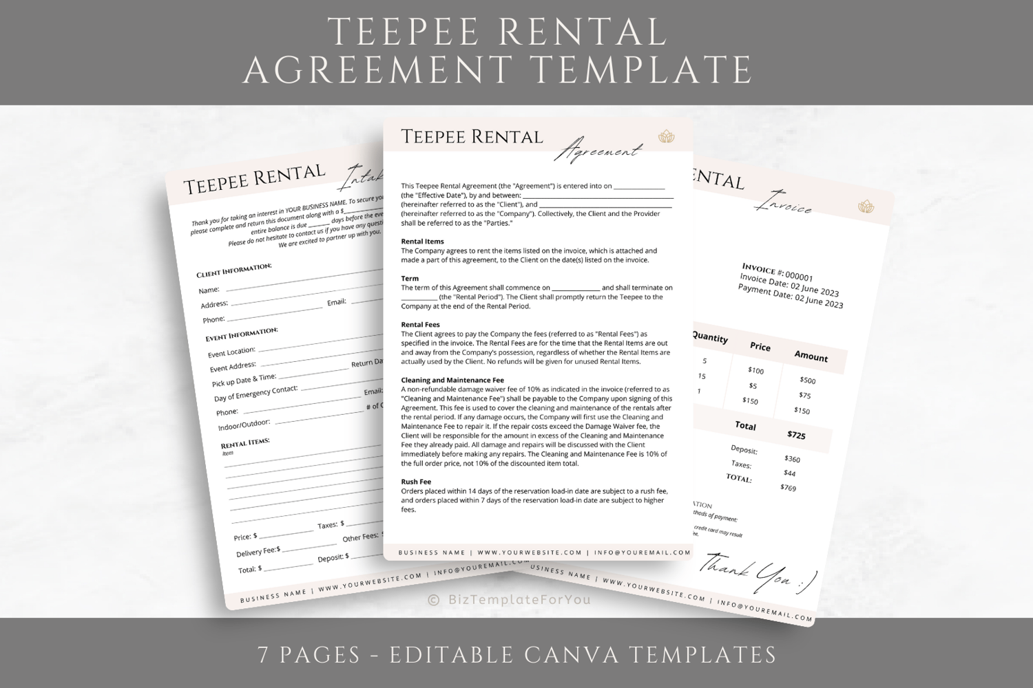 Editable Teepee Rental Agreement, Party Equipment Rental Contract Template, Party Teepee Rental Business Form, incl. Invoice Template, Canva editable #4008
