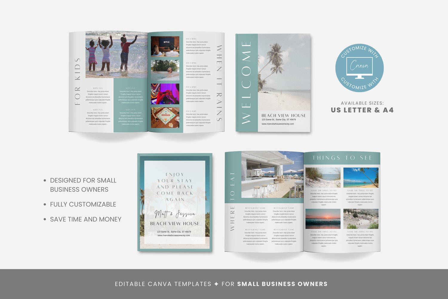 The layout is designed to be welcoming and easy to navigate, with customization options in Canva to add personal touches and photos of the property and align with the rentalโs branding.