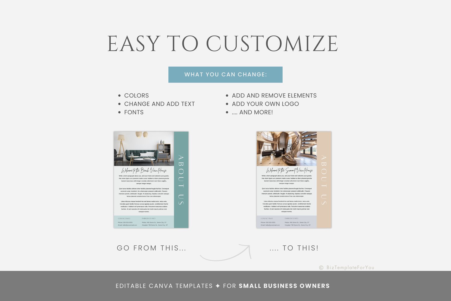 This is a 17-page Airbnb Welcome Book template editable in Canva (FREE Account)! You can add anything that is particular to your business or area. It is also completely customizable. Text, font, and colors are all fully editable to give you complete control of your branding and create a cohesive look for your business.