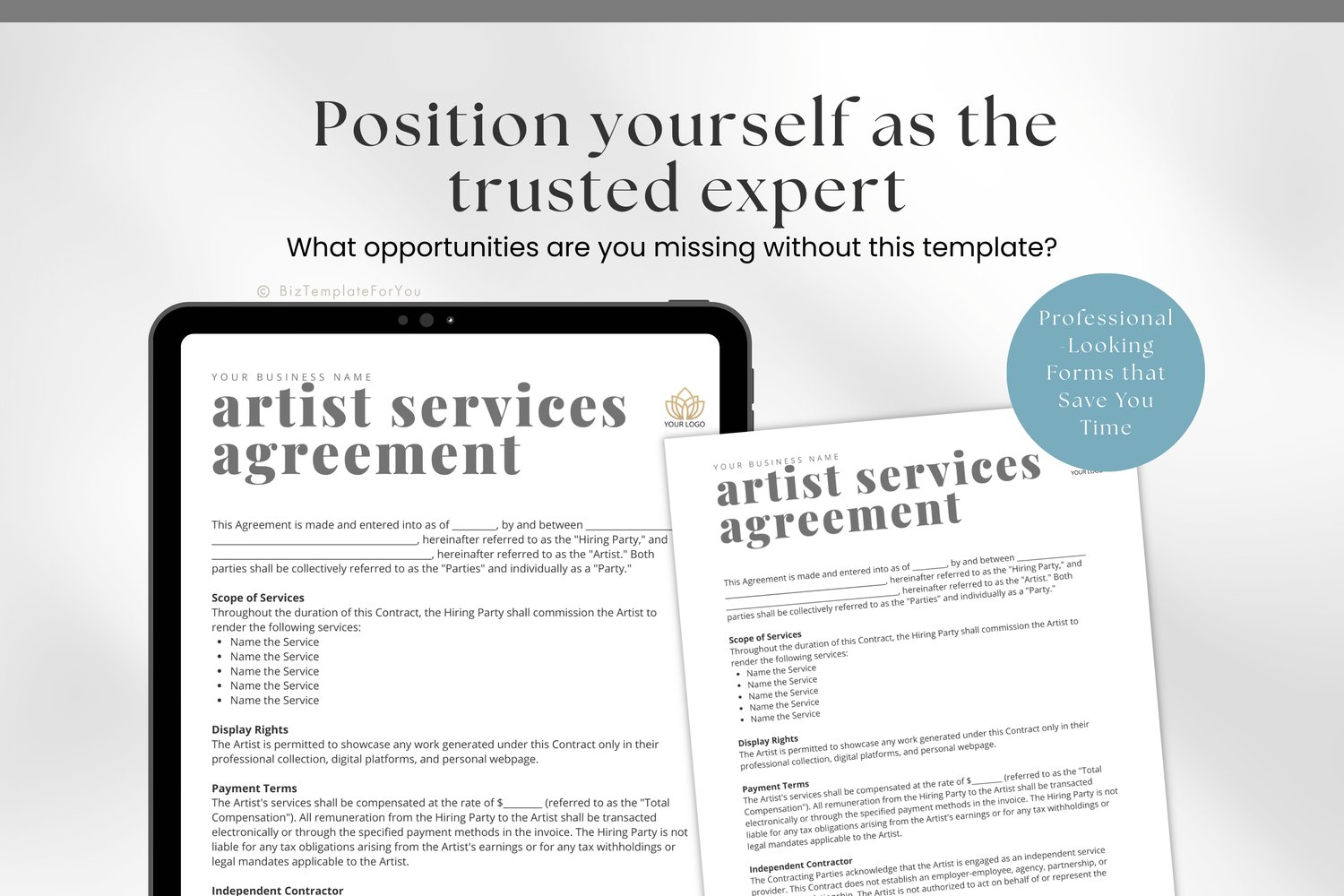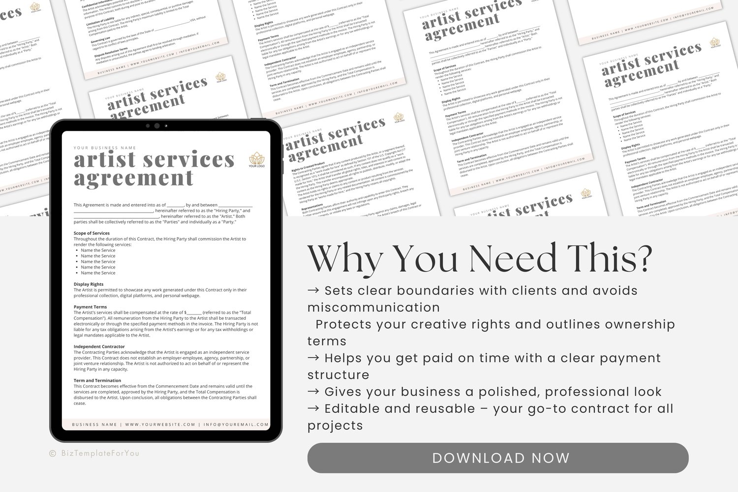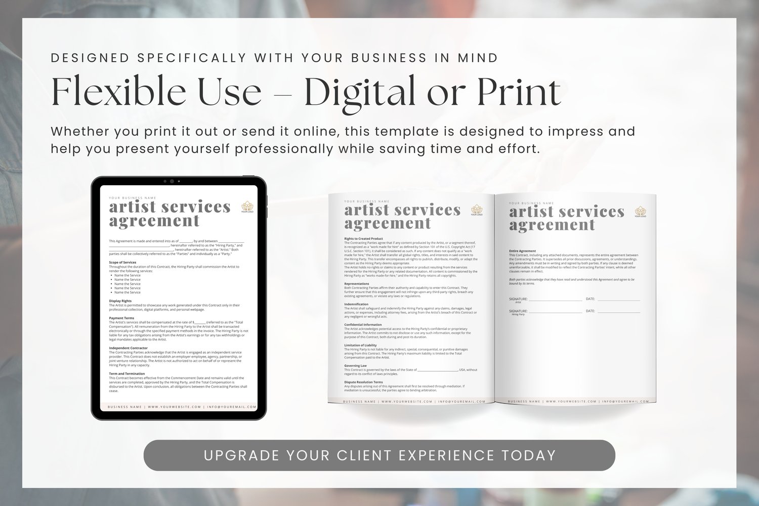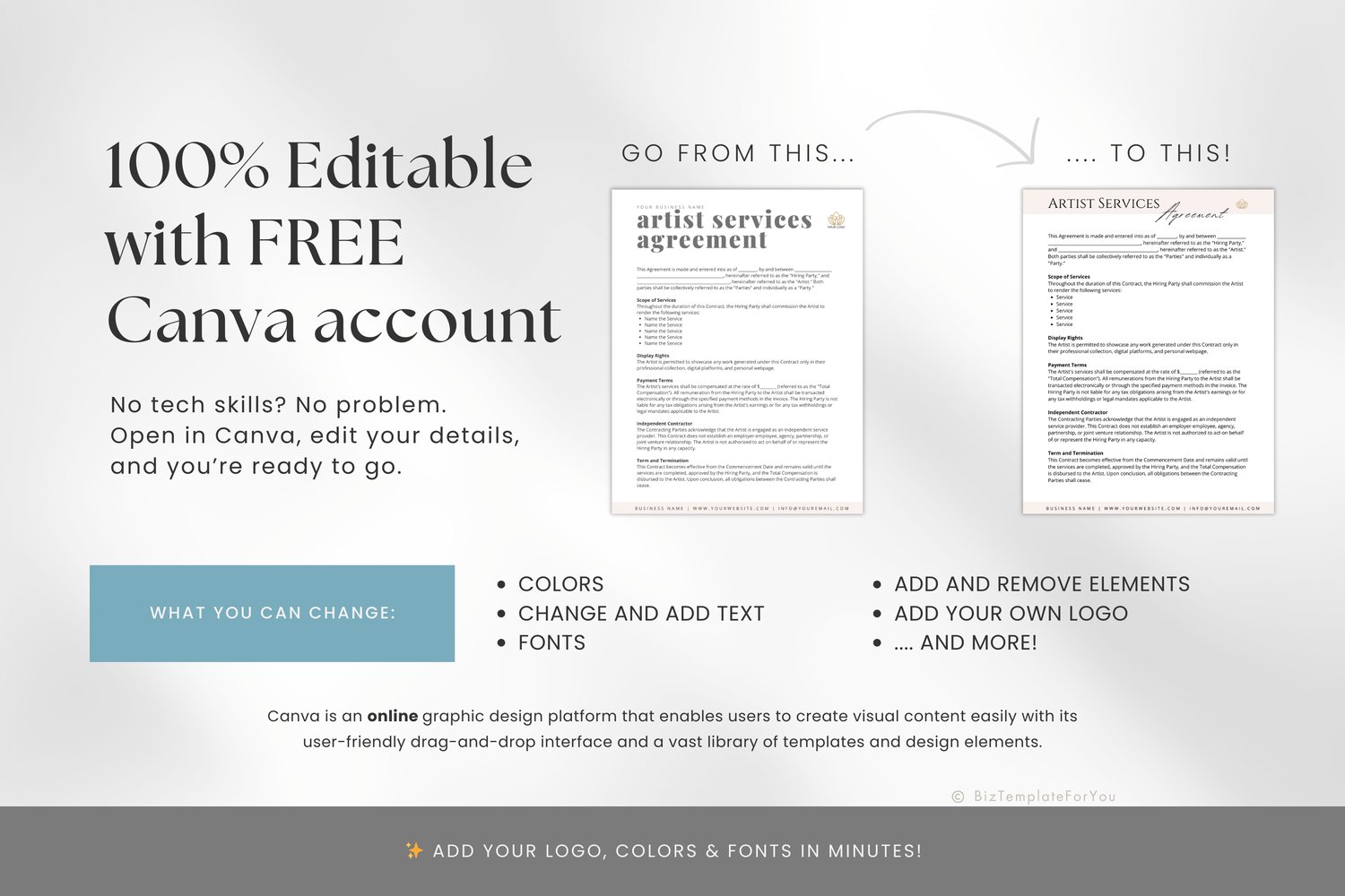 • 1 x Editable Artist Contract Template (3 Pages, US Letter & A4 size)