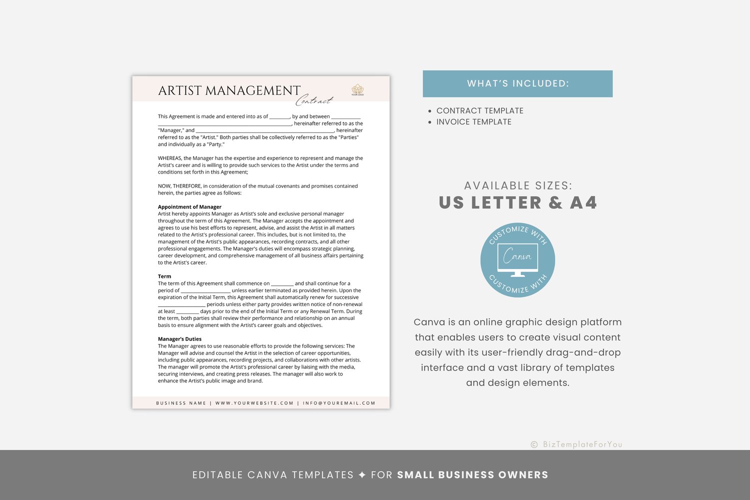 This is a 5-page Artist Management Contract Template editable in Canva (FREE Account)! The text is already written for you, but it can also be easily edited in CANVA to add anything particular to your business or area. It is also completely customizable. Text, font, and colors are all fully editable to give you complete control of your branding and create a cohesive look for your business.