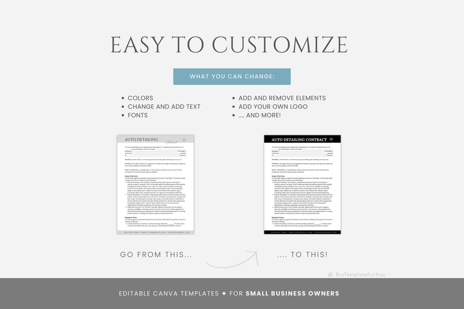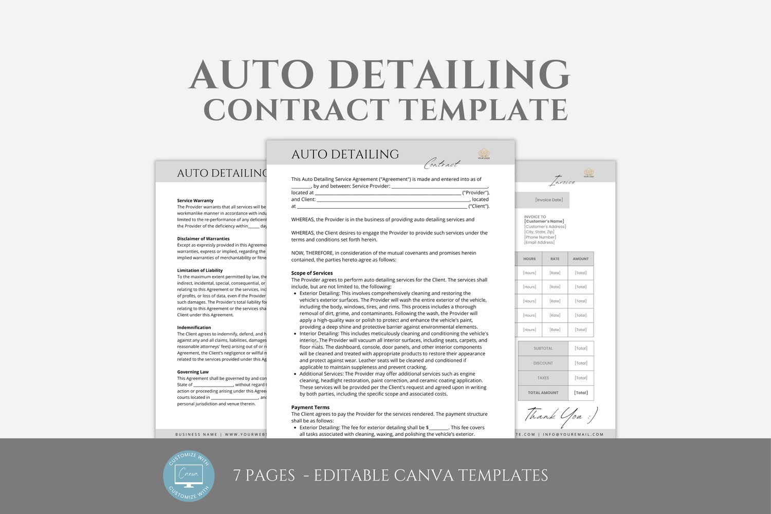 This is a 7-page Car Detailing Service Agreement Template editable in Canva (FREE Account)! The text is already written for you, but it is also easily edited in CANVA to add anything particular to your business or area. It is also completely customizable. Text, font, and colors are all fully editable to give you complete control of your branding and create a cohesive look for your business.