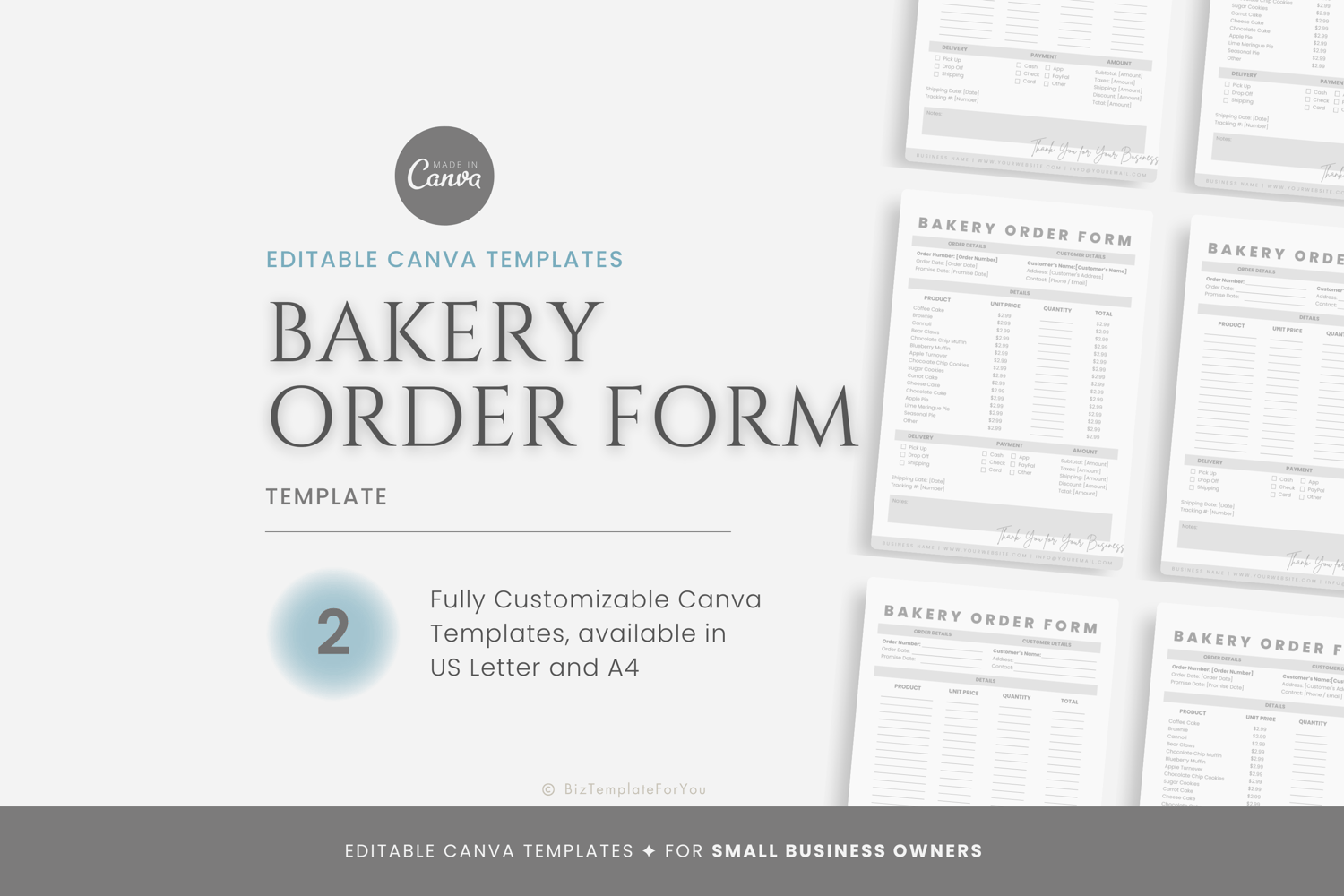 This is a 2-page Bakery Order Form Template editable in Canva (FREE Account)! The text is already written for you, but it is also easily edited in CANVA to add anything that is particular to your business or area. It is also completely customizable. Text, font, and colors are all fully editable to give you complete control of your branding and create a cohesive look for your business.