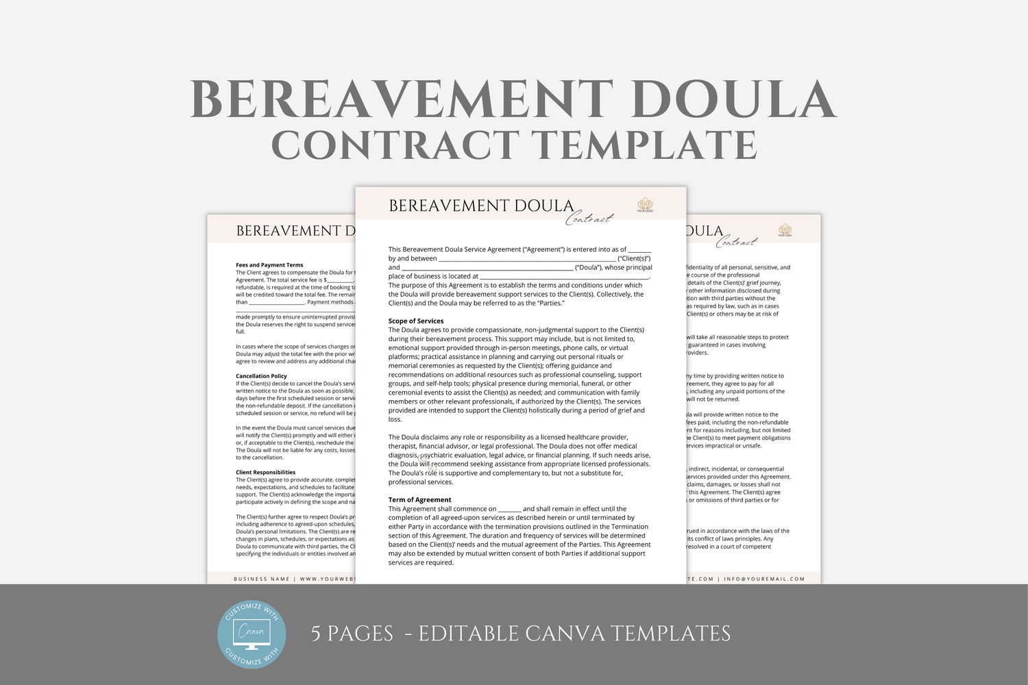 Editable Bereavement Doula Contract Template, Grief Support Doula Service Agreement, Editable Canva Template for Bereavement Professionals #7048
