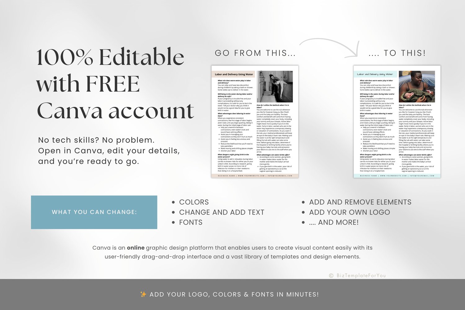 + All elements of our templates are FREE. BizTemplateForYou bears no responsibility for situations wherein the client utilizes PRO elements within Canva, resulting in charges incurred by Canva.