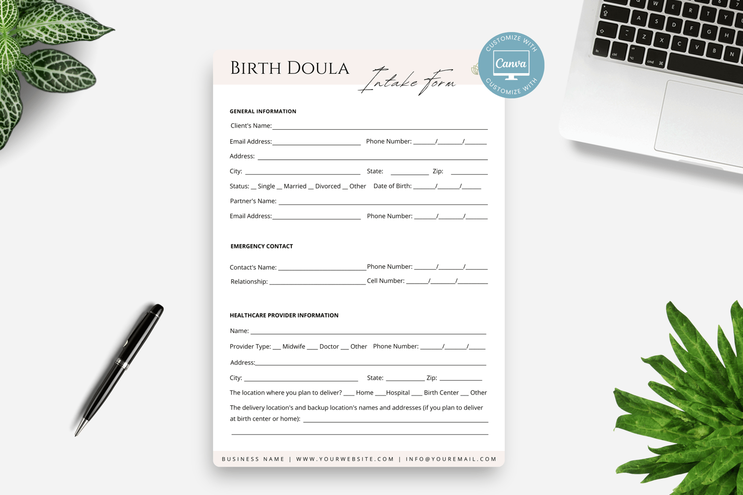 This is a 6-page Birth Doula Client Intake Form Template, editable in Canva (FREE Account)! The text is already written for you, but it is also easily edited in CANVA to add anything that is particular to your business or area. It is also completely customizable. Text, font, and colors are all fully editable to give you complete control of your branding and create a cohesive look for your business.