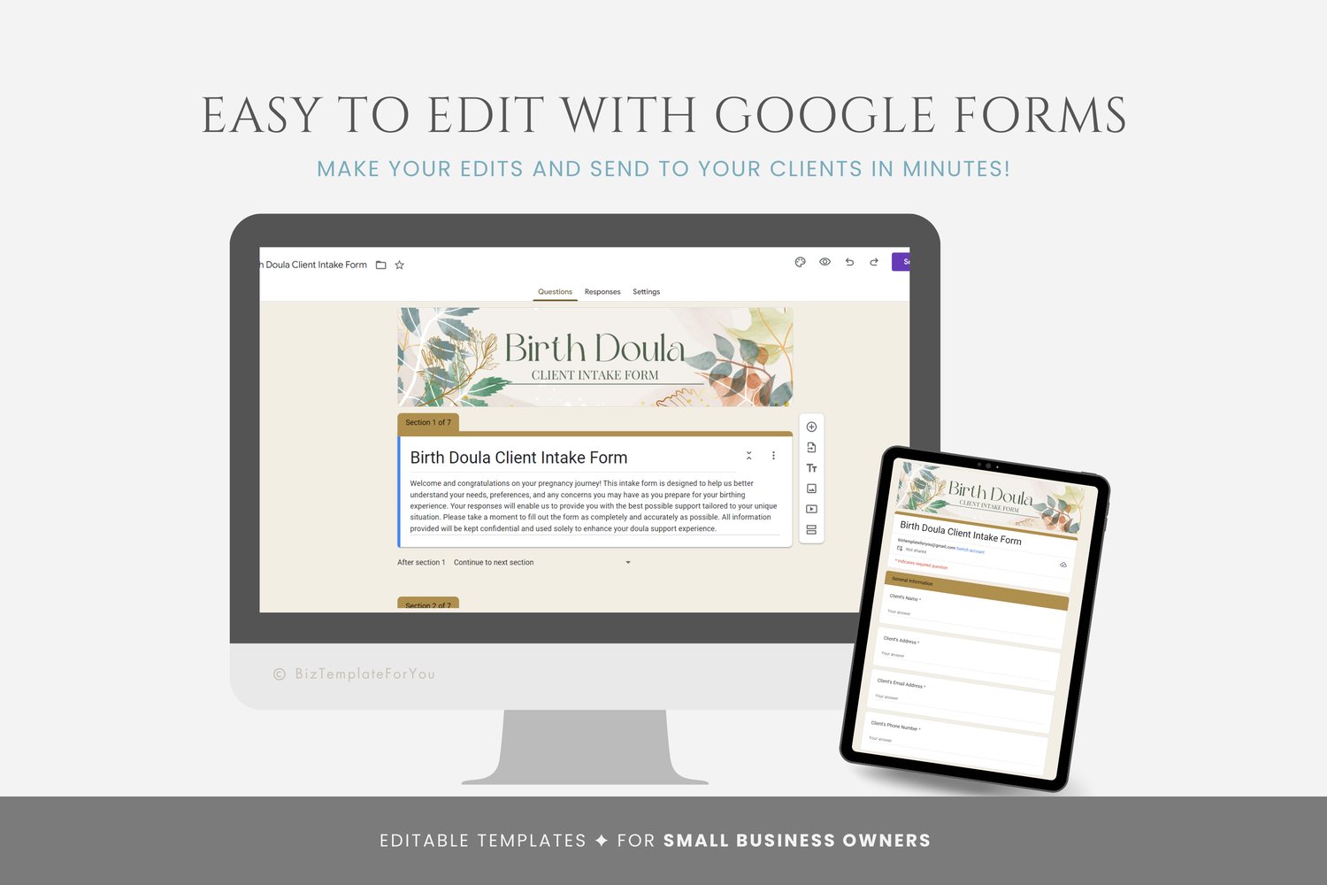 This is a Birth Doula Client Intake Form Template editable in Google Forms! The text is already written for you, but it can also be easily edited in Google Forms to add anything particular to your business or area. It is also completely customizable. Text, font, and colors are all fully editable to give you complete control of your branding and create a cohesive look for your business.