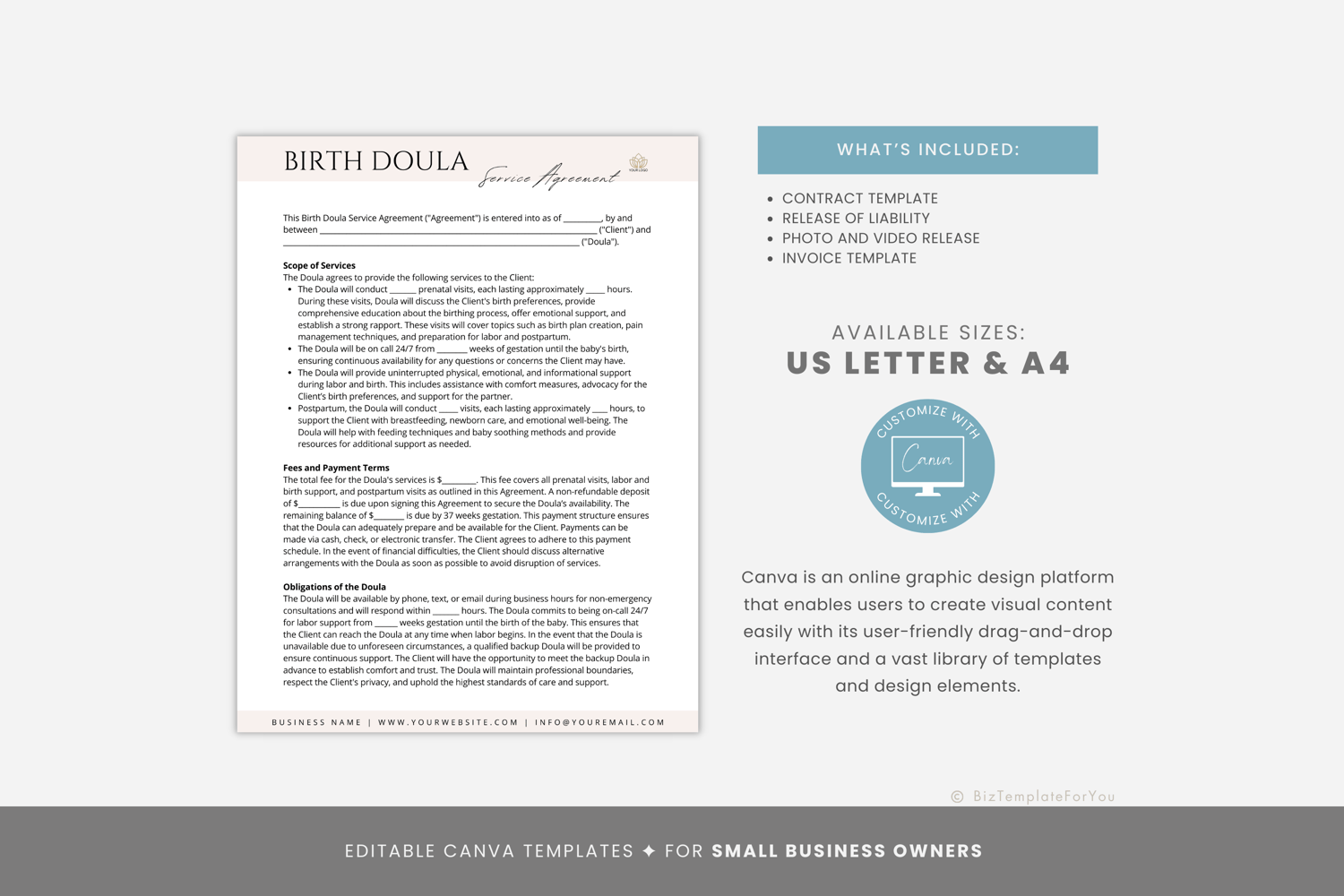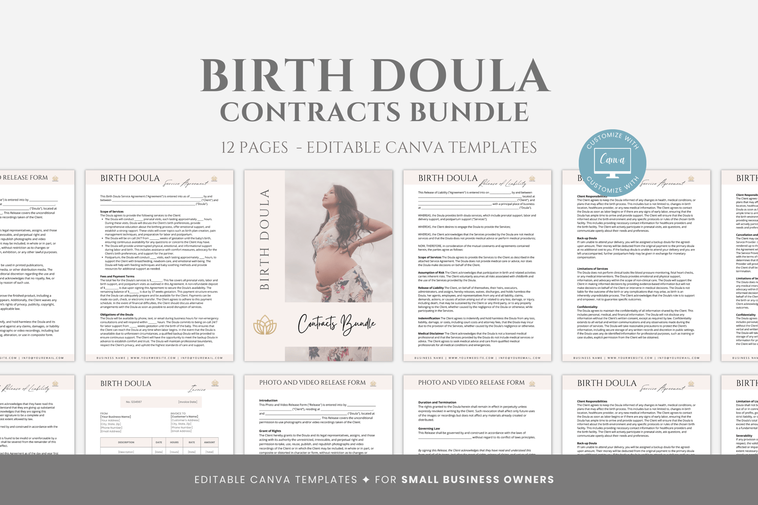 Editable Birth Doula Contracts Bundle, Doula Agreement, Release of Liability, Photo and Video Release Form, Canva editable Doula Forms #1046