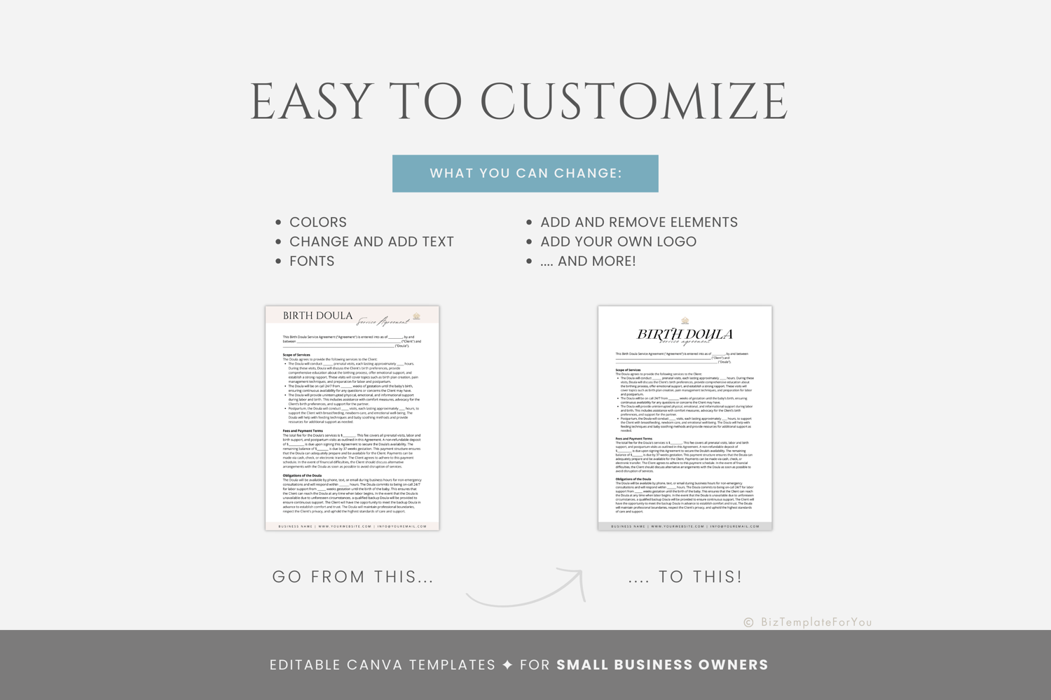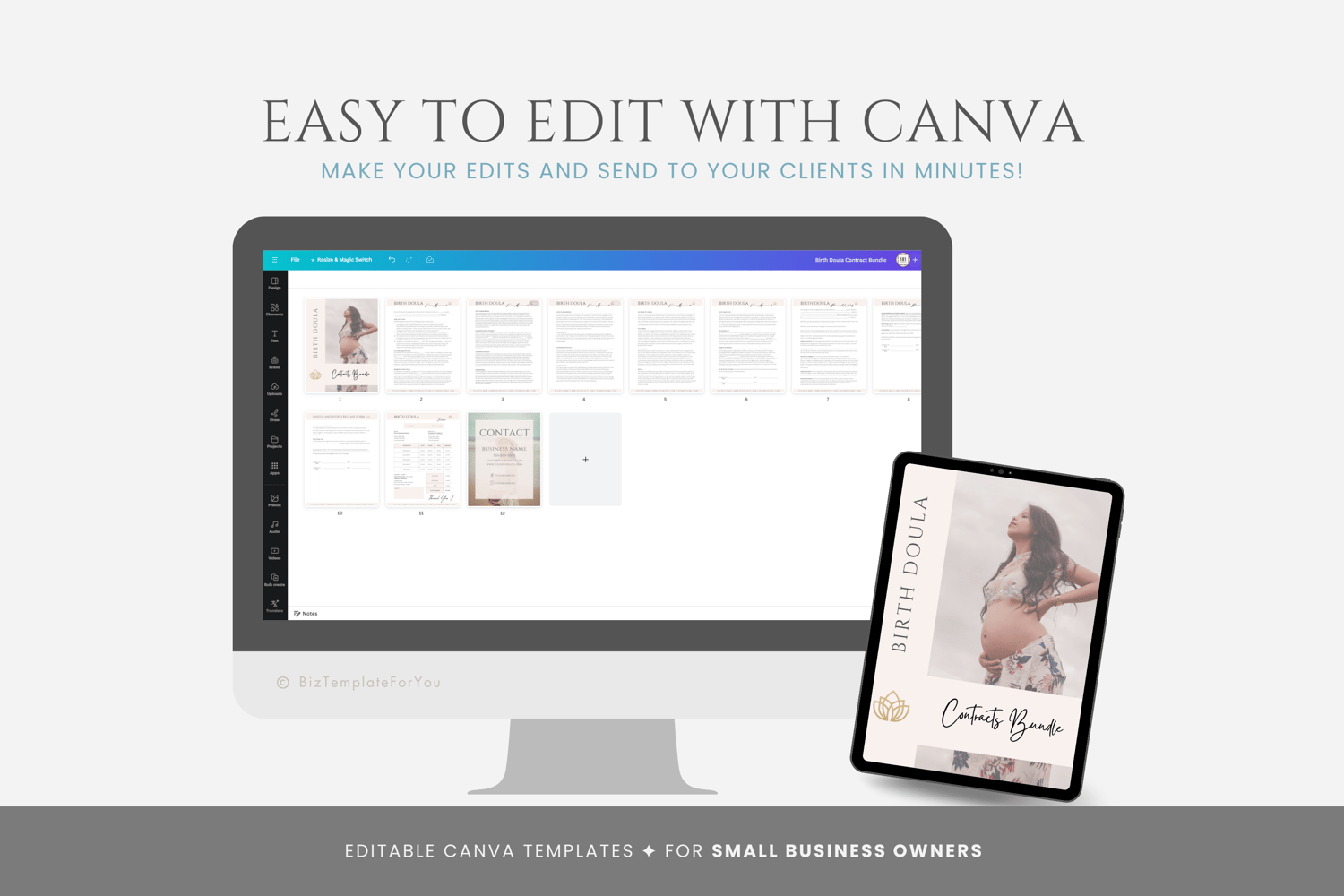 This is a 12-page Birth Doula Contracts Bundle editable in Canva (FREE Account)! The text is already written for you, but it can also be easily edited in CANVA to add anything particular to your business or area. It is also completely customizable. Text, font, and colors are all fully editable to give you complete control of your branding and create a cohesive look for your business.