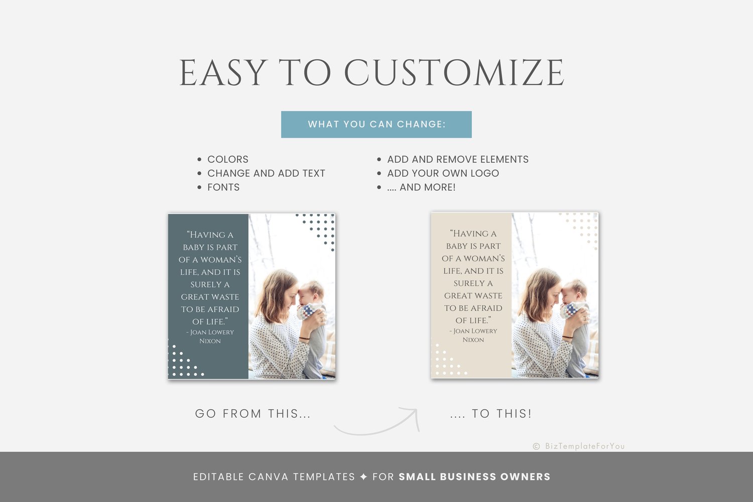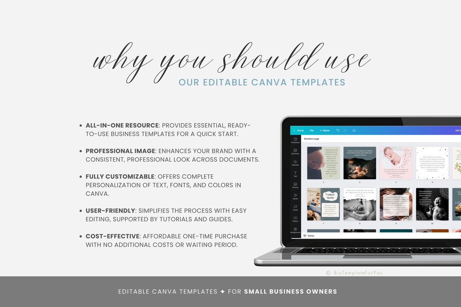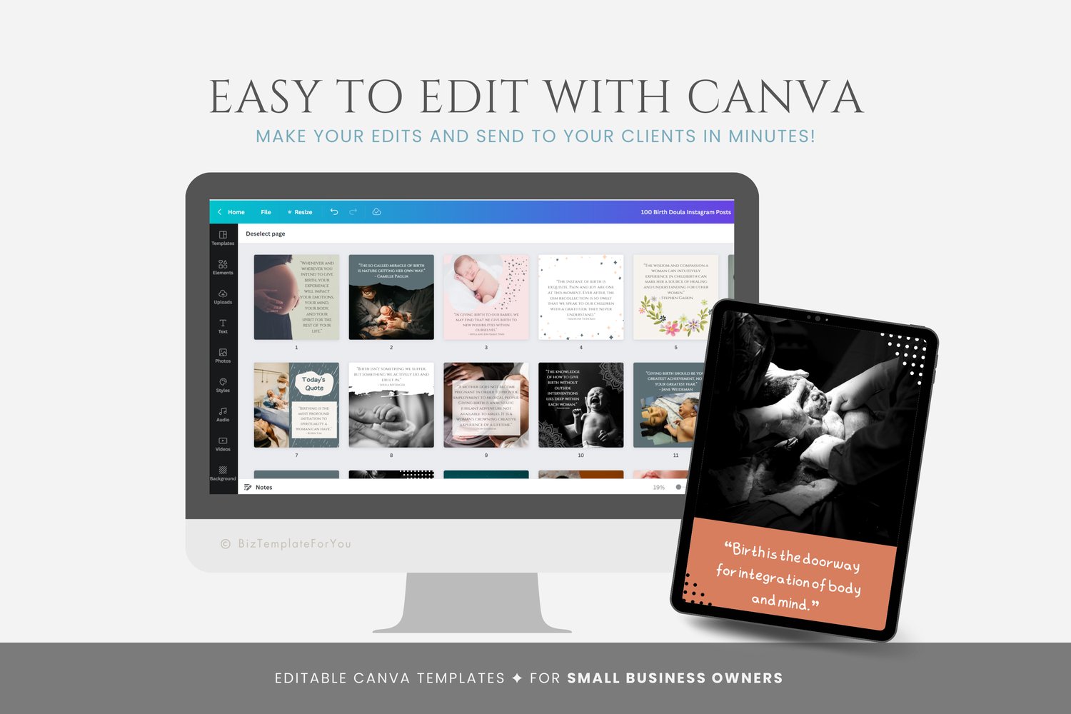 Running a doula business is demanding, and crafting eye-catching social media posts can easily fall by the wayside. These templates streamline the process, saving you countless hours of design work. Consistency is key to growing a loyal following, and with 200 beautiful templates, you’ll have months of content ready to share. Each template is crafted to ensure your brand looks polished and professional so you can focus on supporting your clients while your social media works for you.