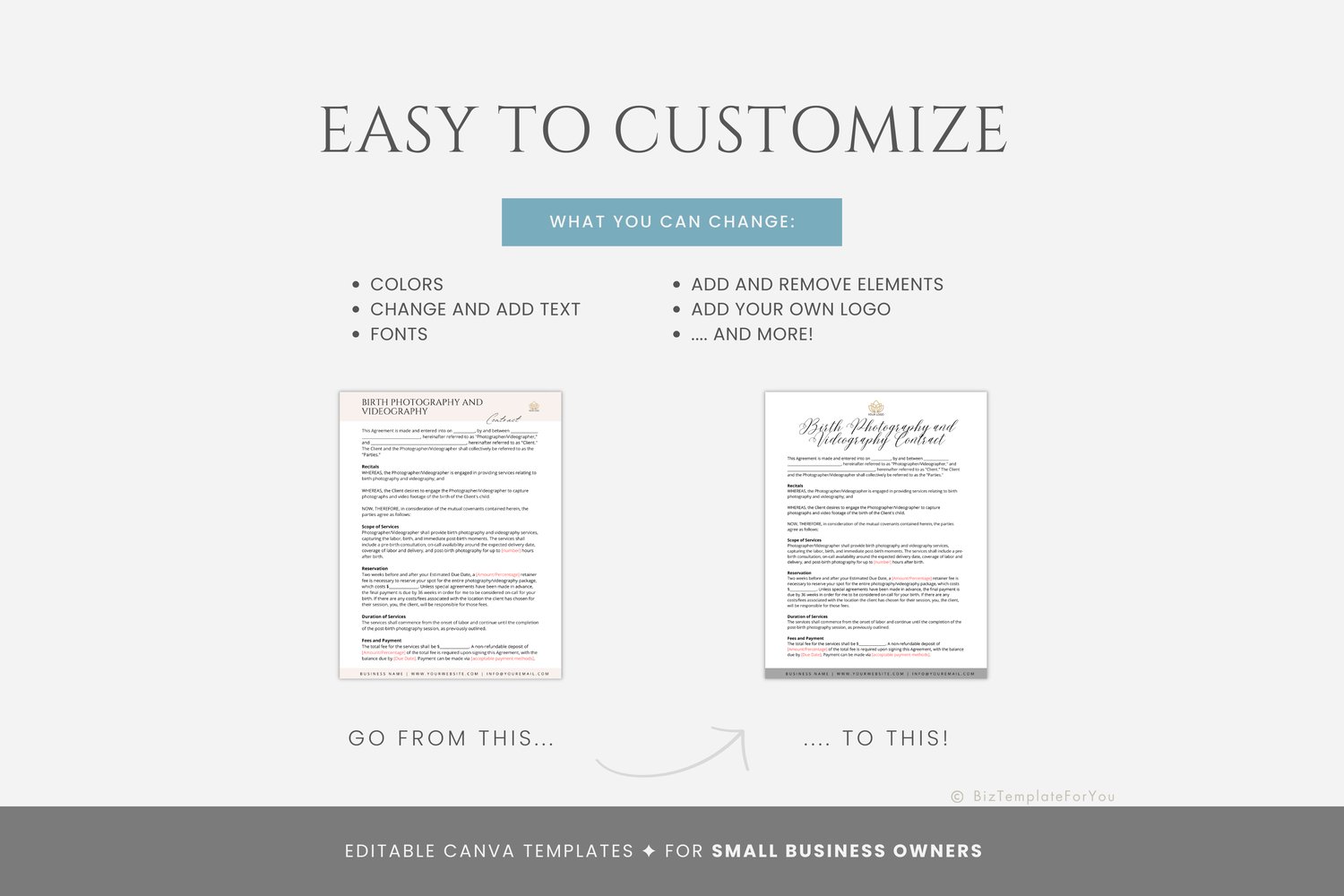 This is a 4-page Birth Photography and Videography Contract Template bundle editable in Canva (FREE Account)! The text is already written for you, but it can also be easily edited in CANVA to add anything particular to your business or area. It is also completely customizable. Text, font, and colors are all fully editable to give you complete control of your branding and create a cohesive look for your business.