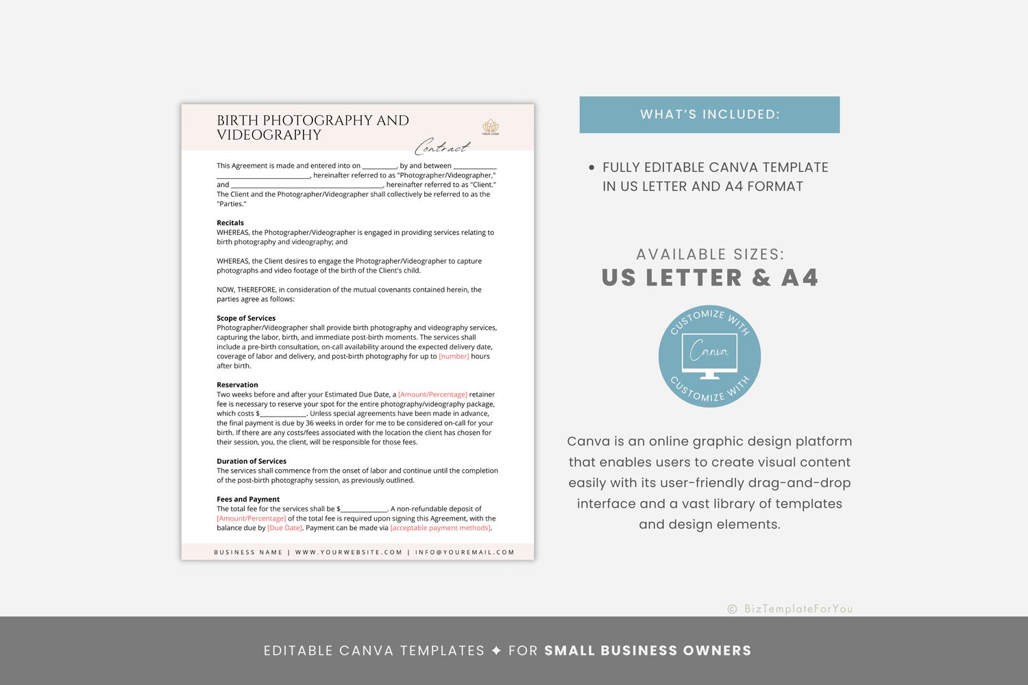 Editable Birth Photography and Videography Contract Template, Freelance Photographers and Videographers, Photography Contract, Canva Template #5025