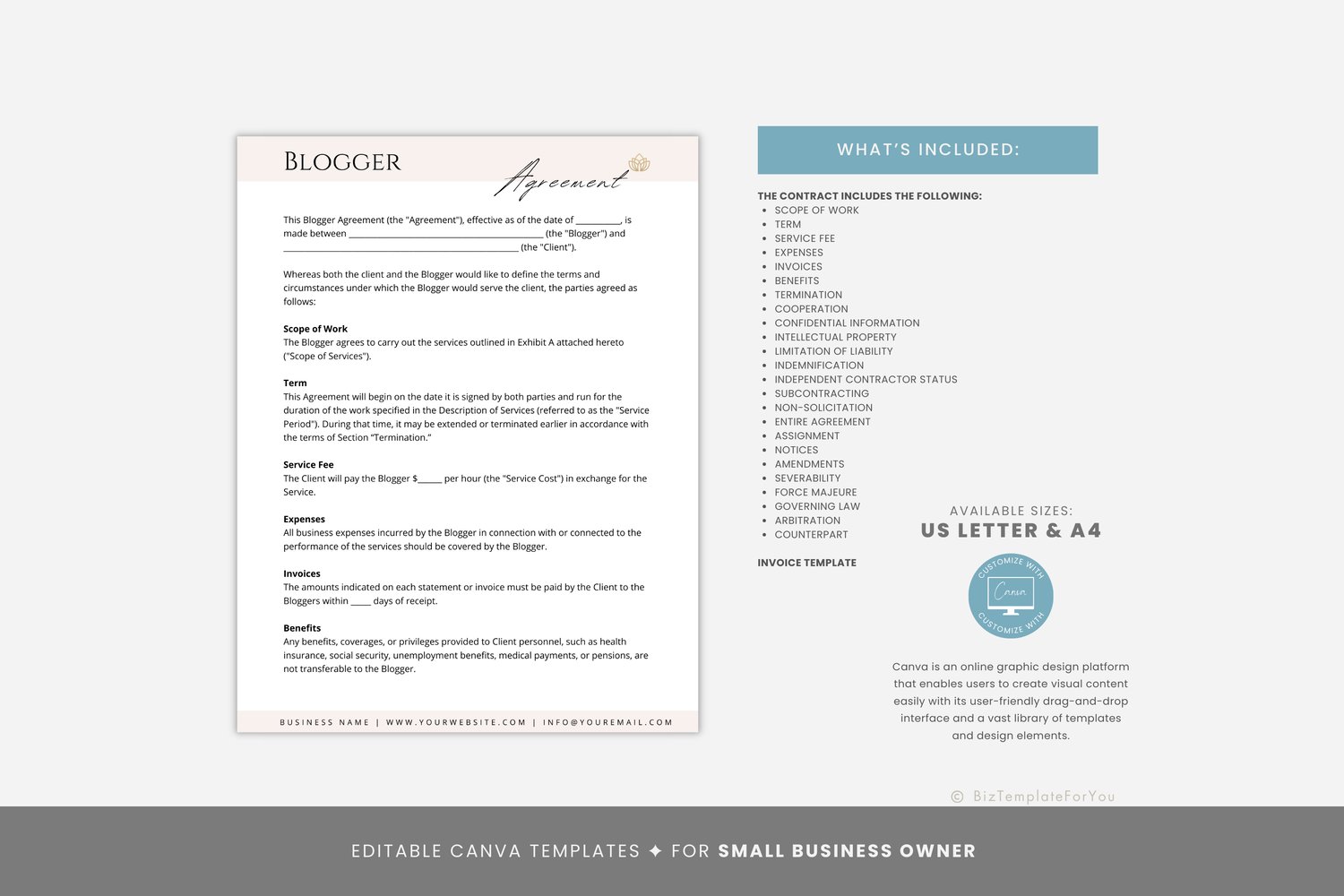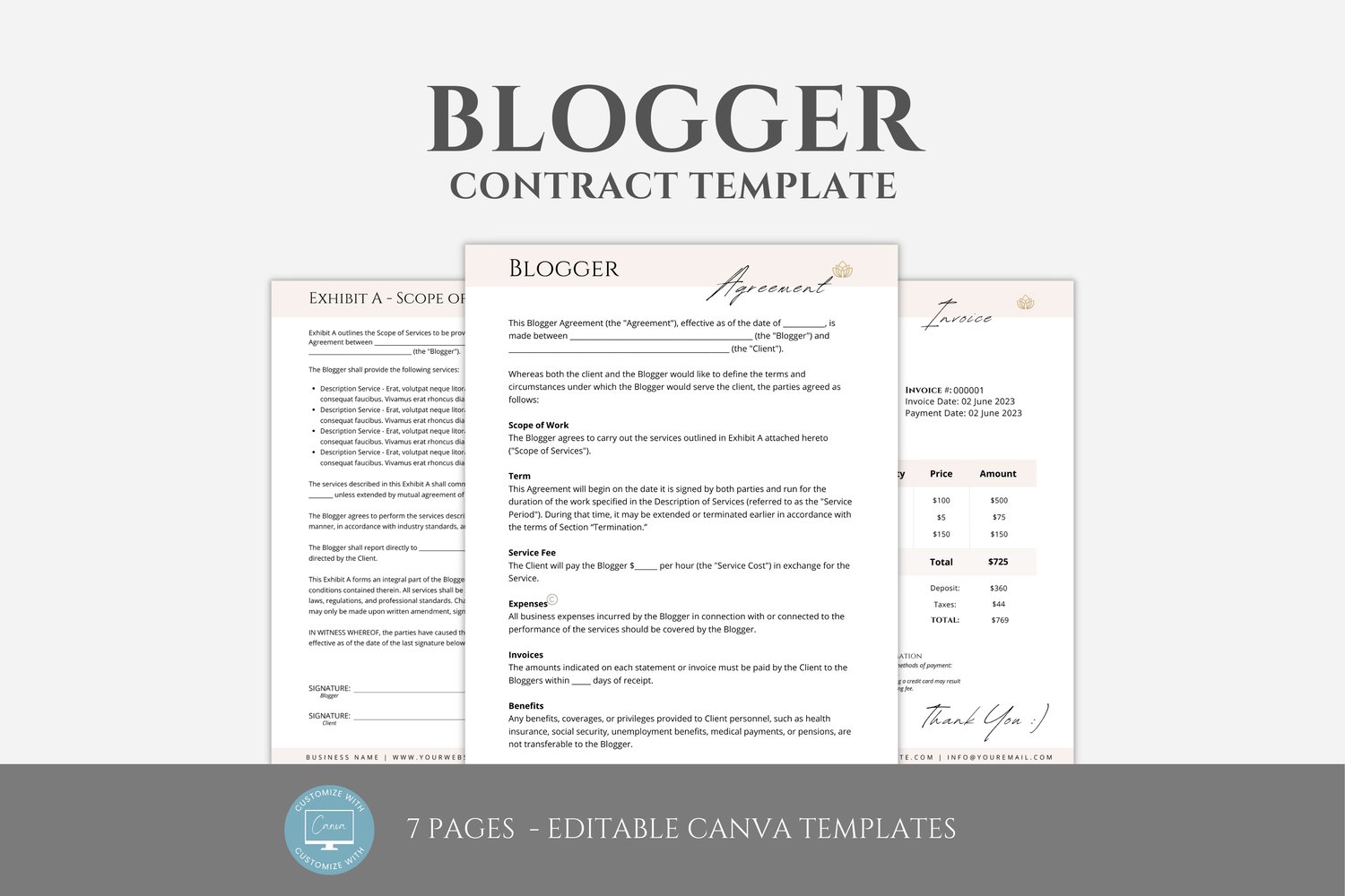 This is a 7-page Blogger Contract Template editable in Canva (FREE Account)! The text is already written for you, but it can also be easily edited in CANVA to add anything particular to your business or area. It is also completely customizable. Text, font, and colors are all fully editable to give you complete control of your branding and create a cohesive look for your business.