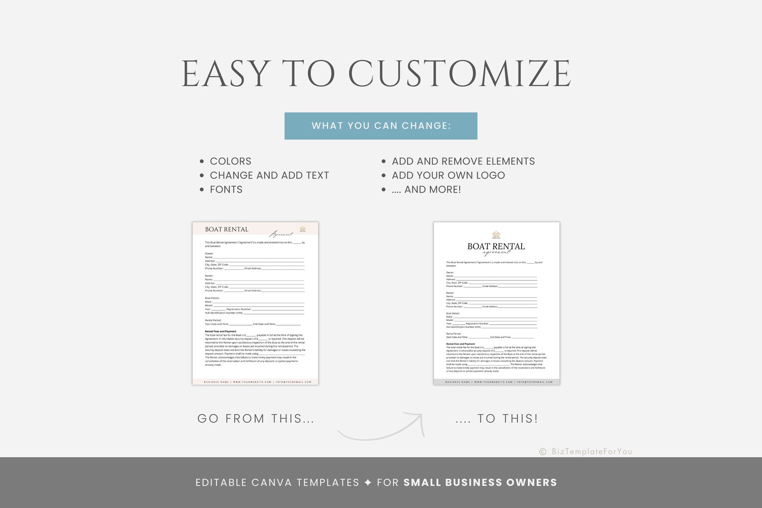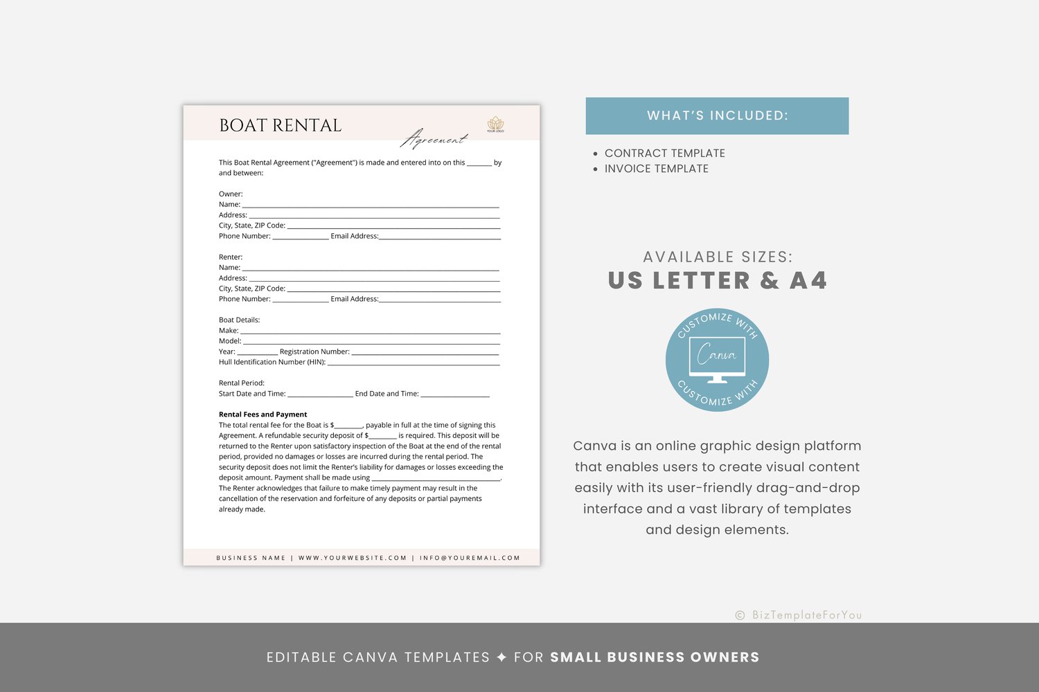 This is a 6-page Boat Rental Agreement Template editable in Canva (FREE Account)! The text is already written for you but it is also easily edited in CANVA to add anything that is particular to your business or area it is also completely customizable. Text, font, and colors are all fully editable to give you complete control of your branding and create a cohesive look for your business.