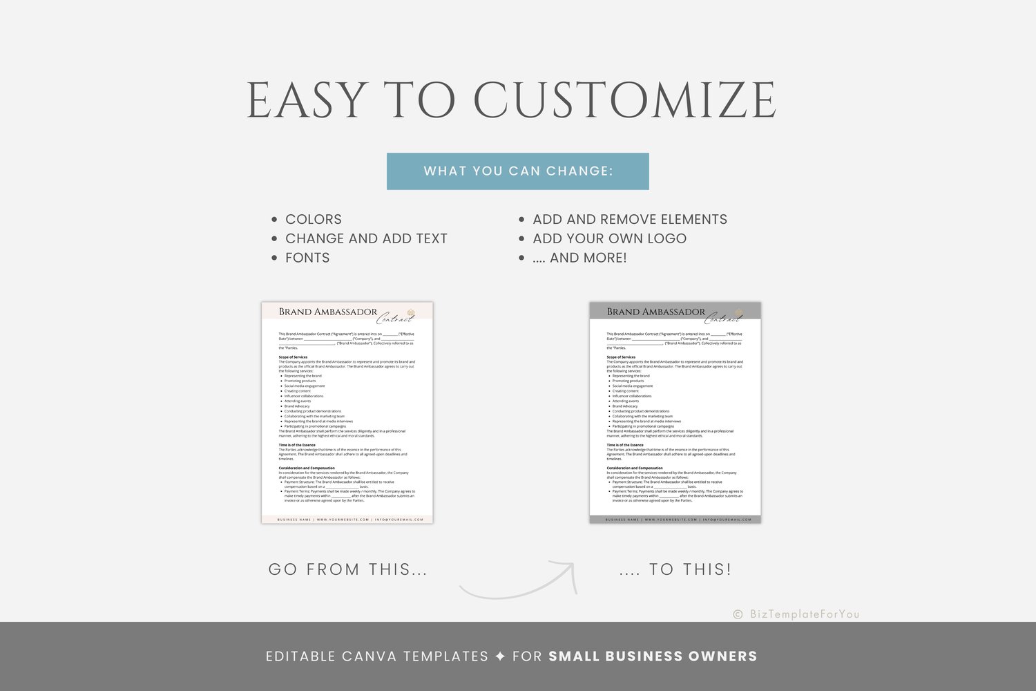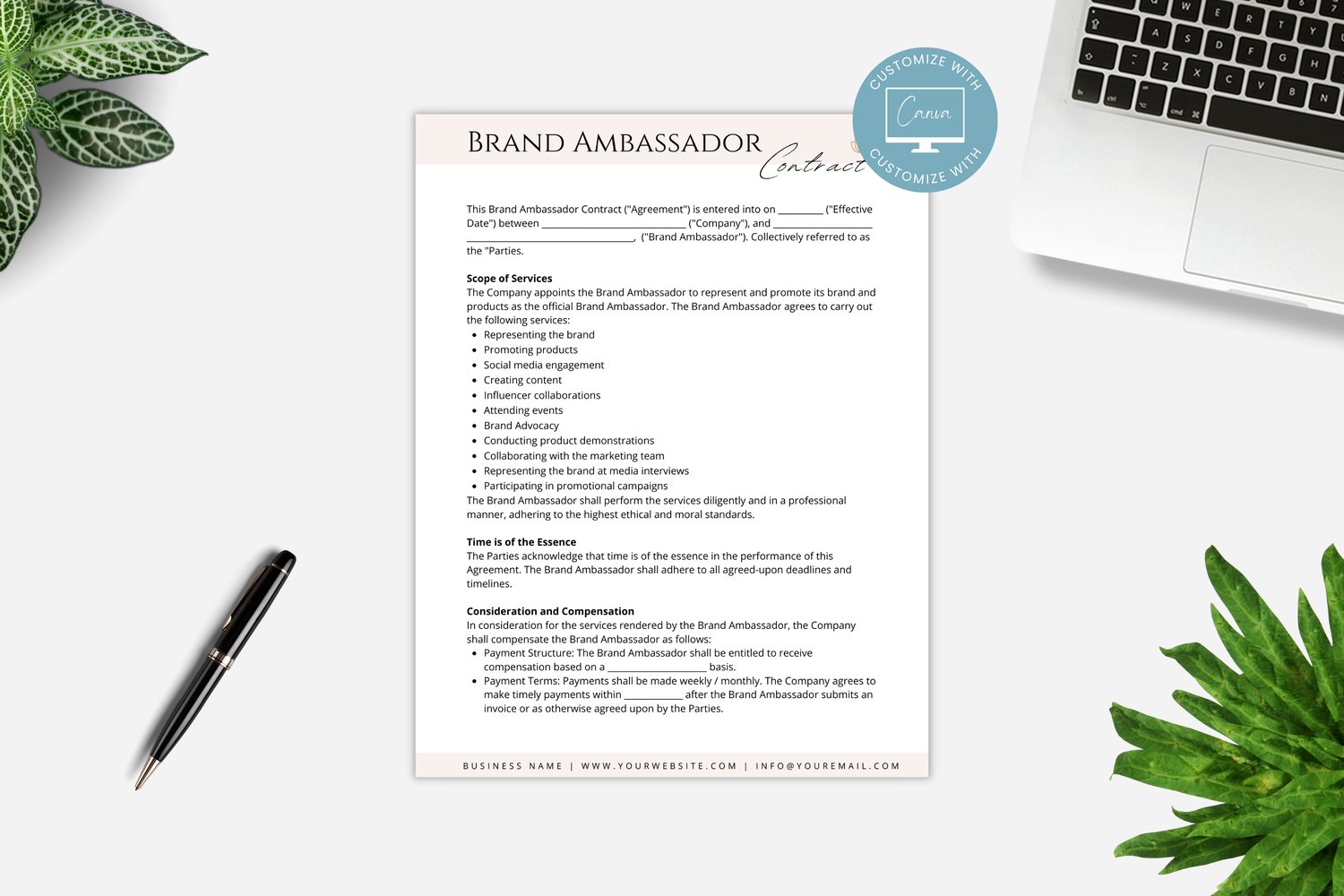 This is a 7-page Brand Ambassador Contract Template editable in Canva (FREE Account)! The text is already written for you, but it is also easily edited in CANVA to add anything that is particular to your business or area. It is also completely customizable. Text, font, and colors are all fully editable to give you complete control of your branding and create a cohesive look for your business.