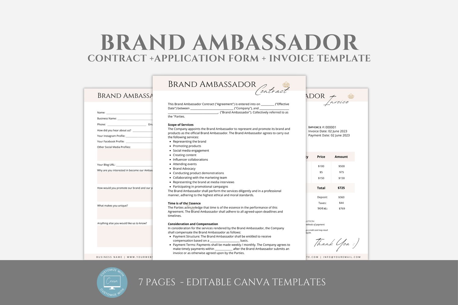 Editable Brand Ambassador Contract Template, Social Media Influencer Service Agreement, incl. Application Form and Invoice Template #3046