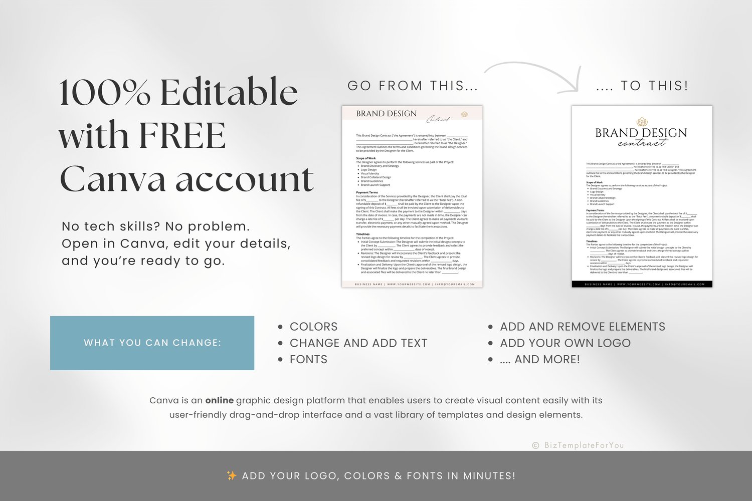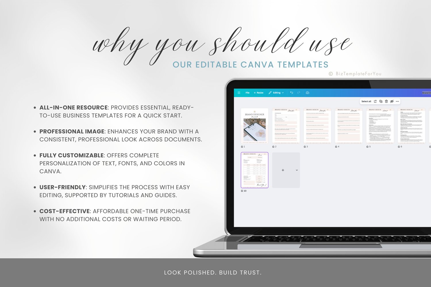 + All elements of our templates are FREE. BizTemplateForYou bears no responsibility for situations wherein the client utilizes PRO elements within Canva, resulting in charges incurred by Canva.