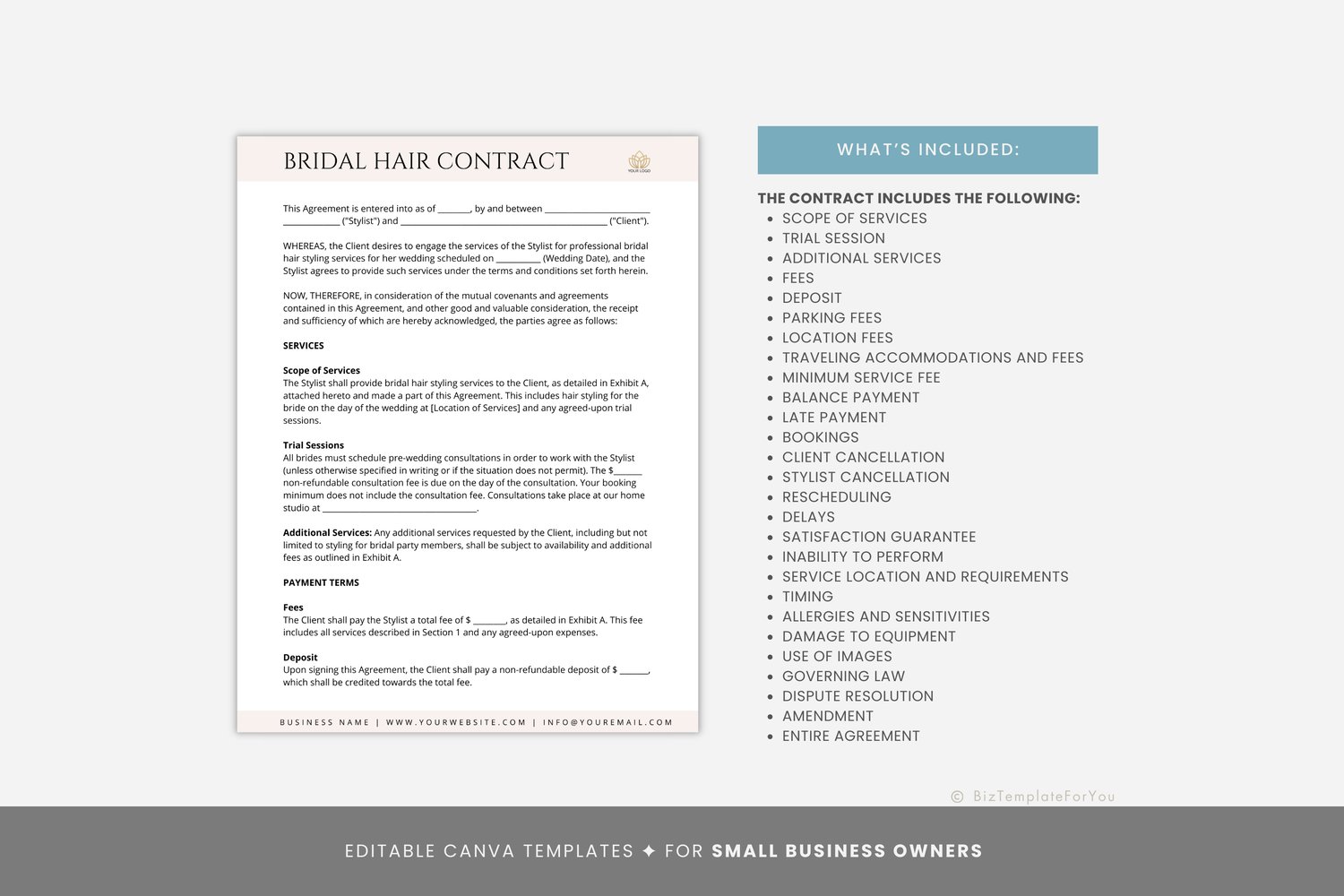 Editable Professional Bridal Hair Contract Template for Freelance Hairstylists, Bridal Hair Contract Service Agreement, Editable in Canva #2020