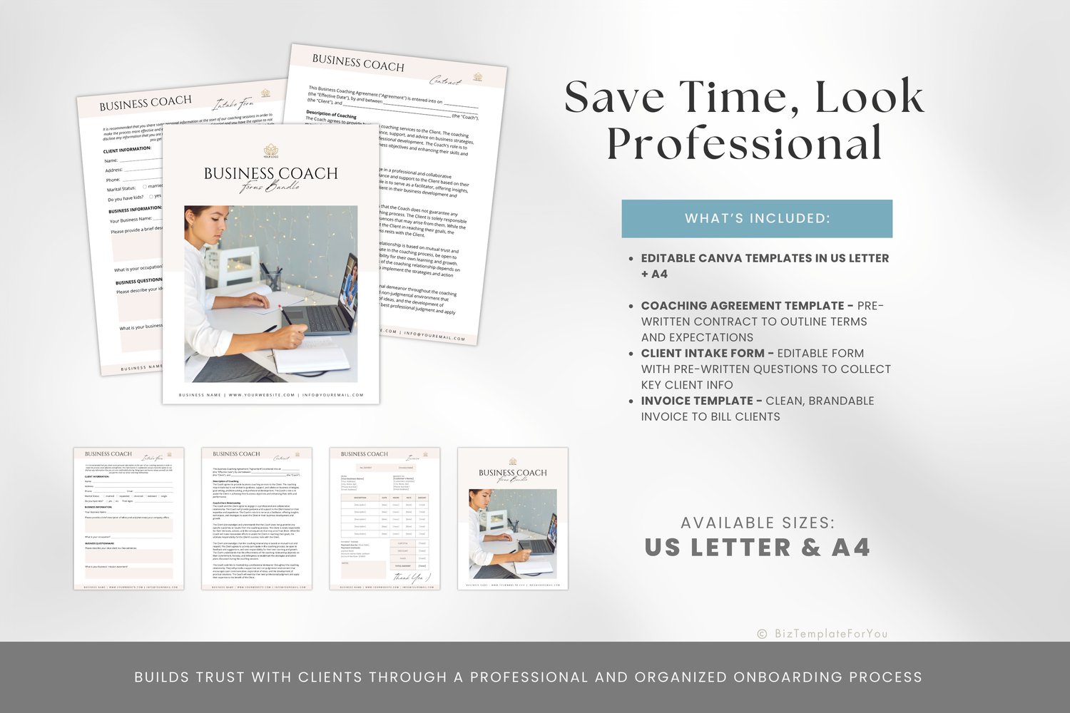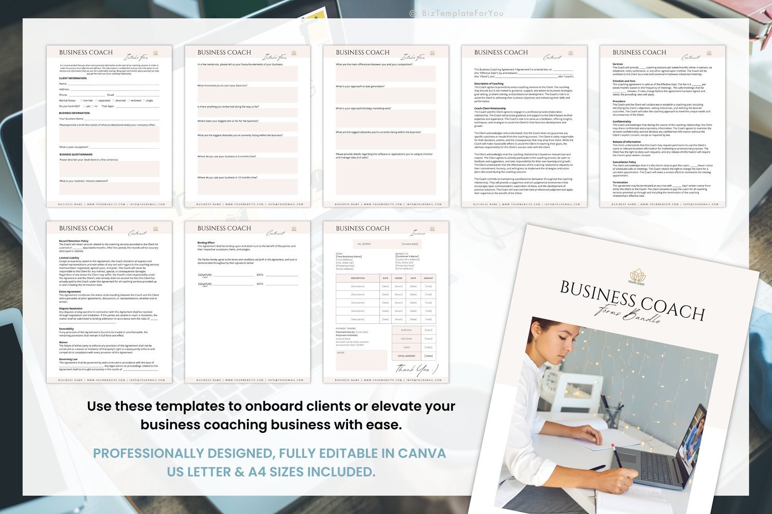 This editable Canva kit includes a coaching agreement, client intake form, and invoice template, all in A4 and US Letter formats. The agreement and intake form come with pre-written text, so you don’t have to start from scratch—just customize to match your voice and brand.