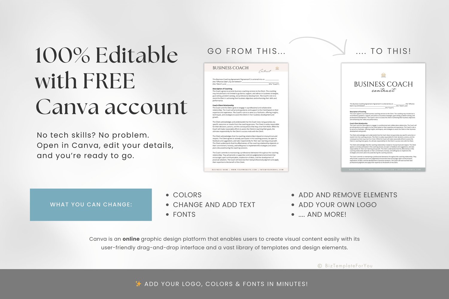 + All elements of our templates are FREE. BizTemplateForYou bears no responsibility for situations wherein the client utilizes PRO elements within Canva, resulting in charges incurred by Canva.