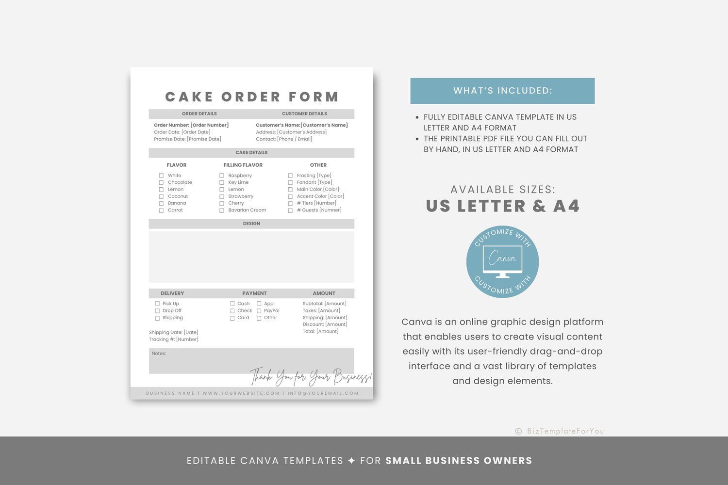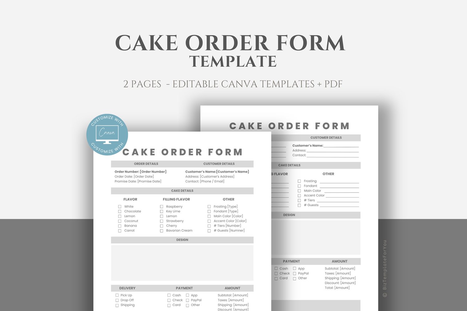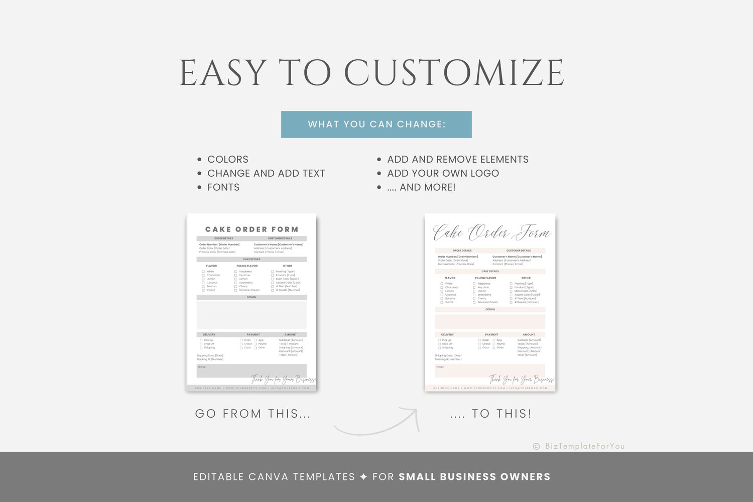 This is a 2-page Cake Order Form Template editable in Canva (FREE Account)! The text is already written for you, but it can also be easily edited in CANVA to add anything particular to your business or area. It is also completely customizable. Text, font, and colors are all fully editable to give you complete control of your branding and create a cohesive look for your business.