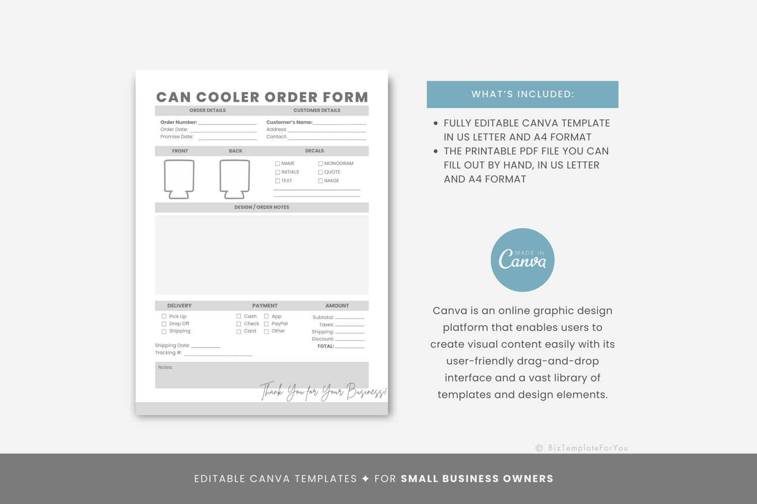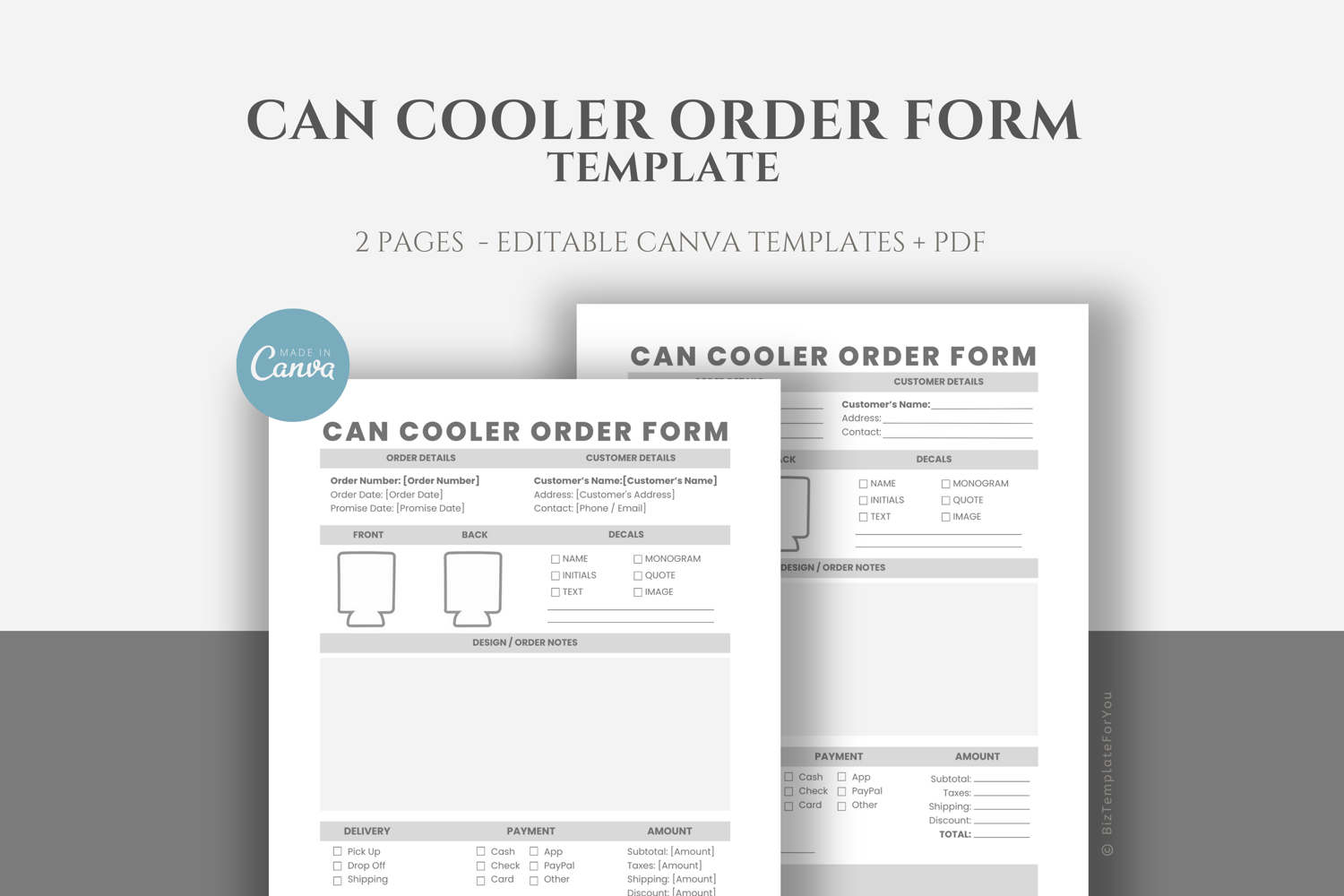 This is a 2-page Can Cooler Order Form Template editable in Canva (FREE Account)! The text is already written for you, but it is also easily edited in CANVA to add anything that is particular to your business or area. It is also completely customizable. Text, font, and colors are all fully editable to give you complete control of your branding and create a cohesive look for your business.