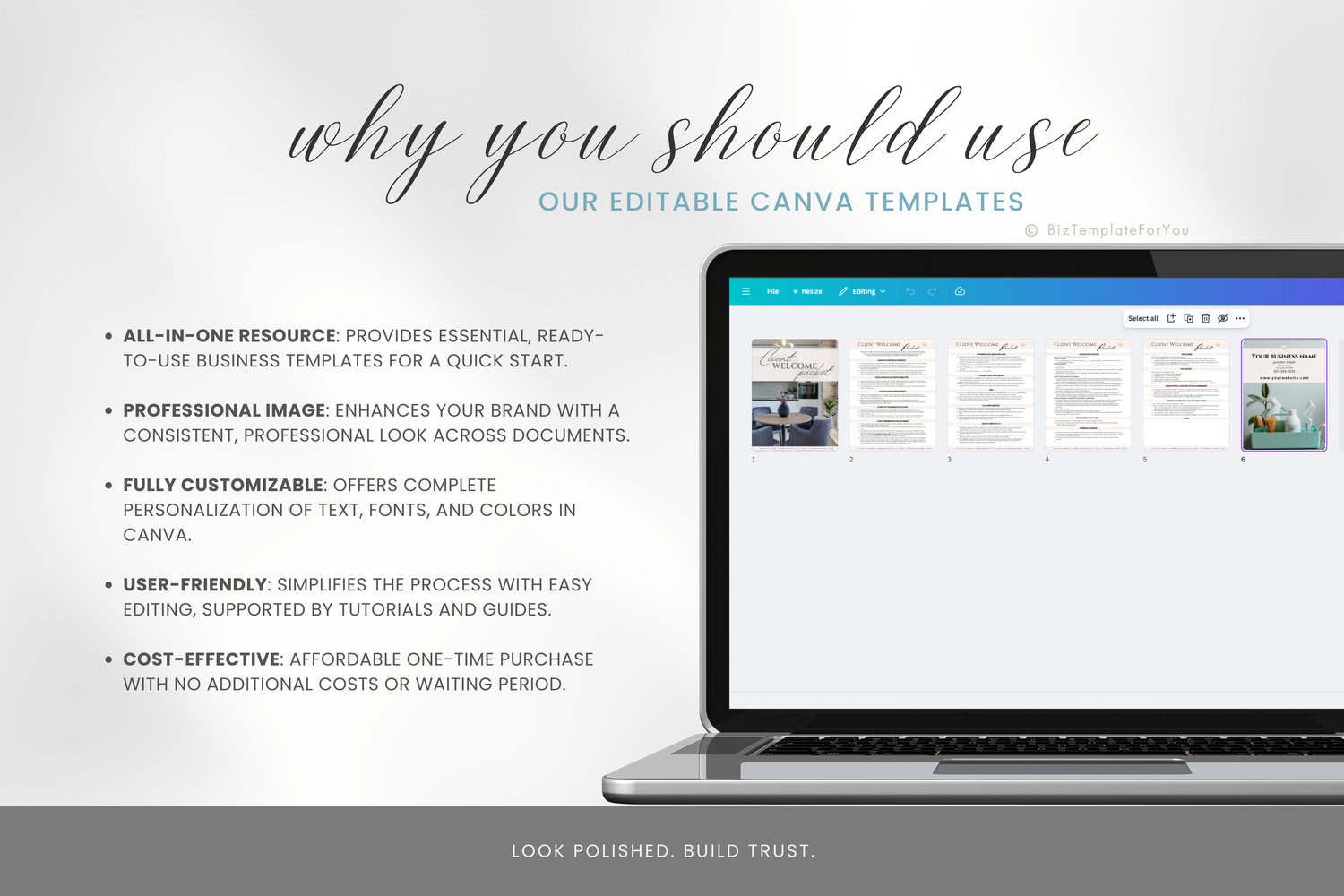 + All elements of our templates are FREE. BizTemplateForYou bears no responsibility for situations wherein the client utilizes PRO elements within Canva, resulting in charges incurred by Canva.