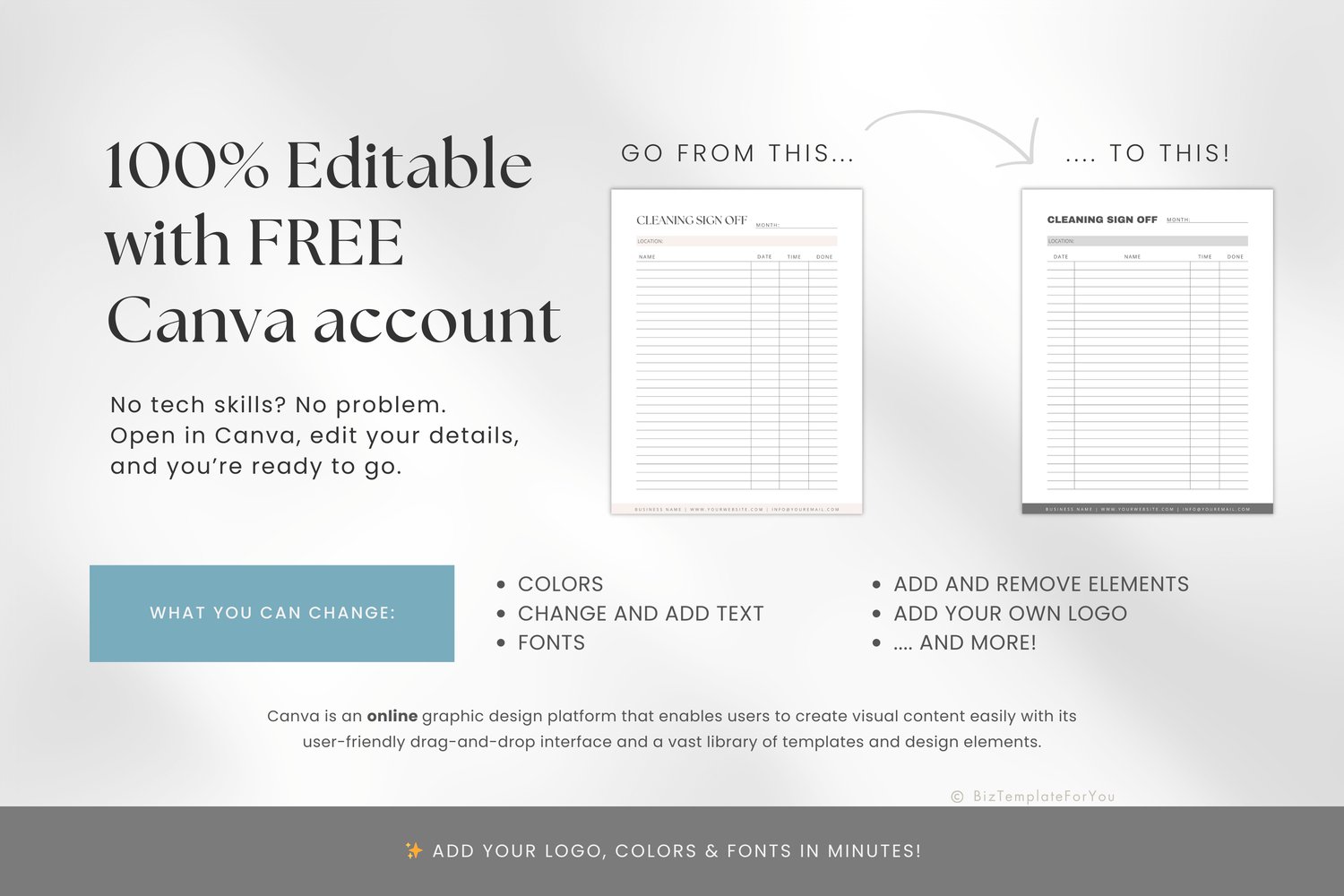 + All elements of our templates are FREE. BizTemplateForYou bears no responsibility for situations wherein the client utilizes PRO elements within Canva, resulting in charges incurred by Canva.