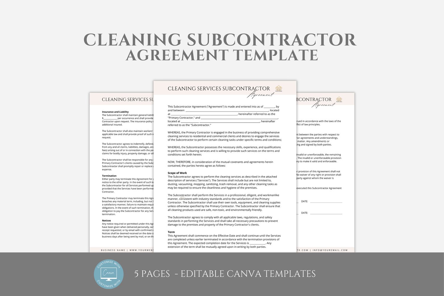 This is a 5-page Cleaning Subcontractor Agreement Template editable in Canva (FREE Account)! The text is already written for you, but it can also be easily edited in CANVA to add anything particular to your business or area. It is also completely customizable. Text, font, and colors are all fully editable to give you complete control of your branding and create a cohesive look for your business.