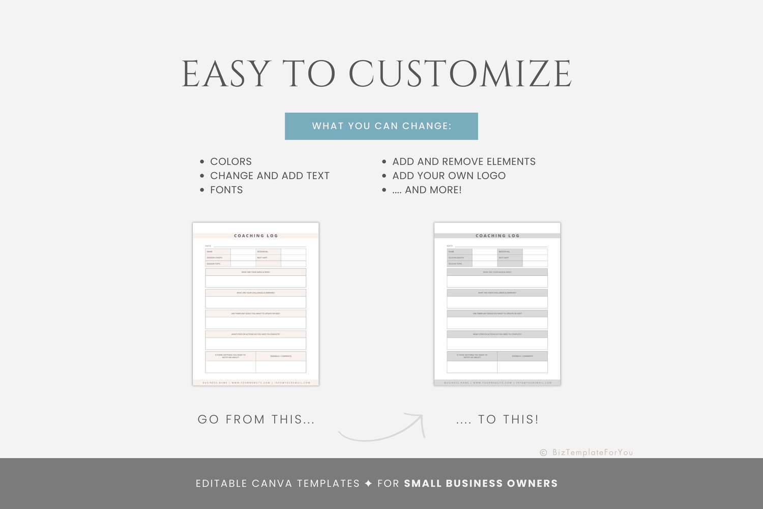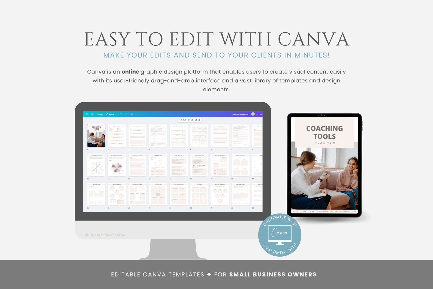 This is a 35-page Coaching Tool Planner Template editable in Canva (FREE Account)! The text is already written for you, but it is also easily edited in CANVA to add anything that is particular to your business or area. It is also completely customizable. Text, font, and colors are all fully editable to give you complete control of your branding and create a cohesive look for your business.