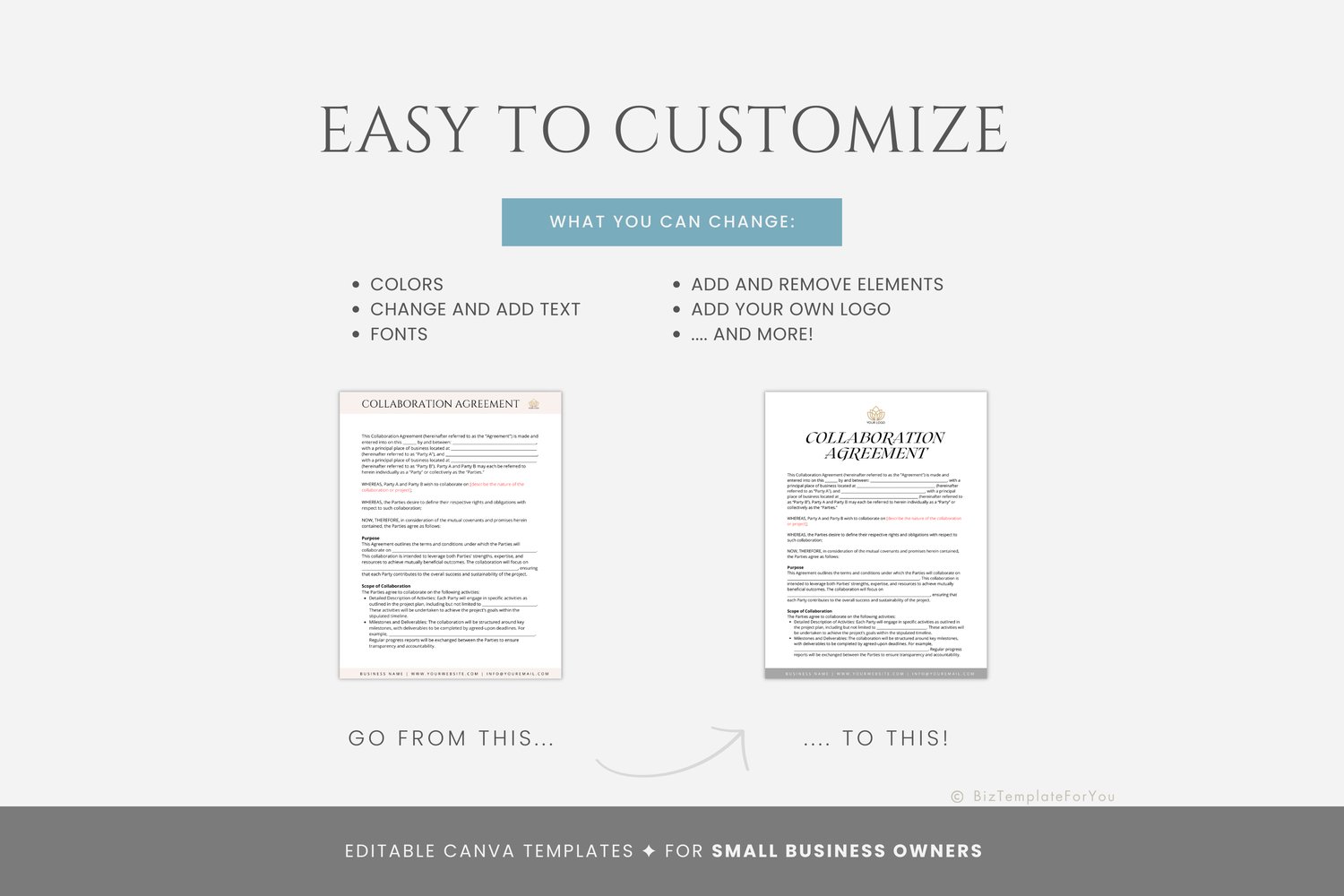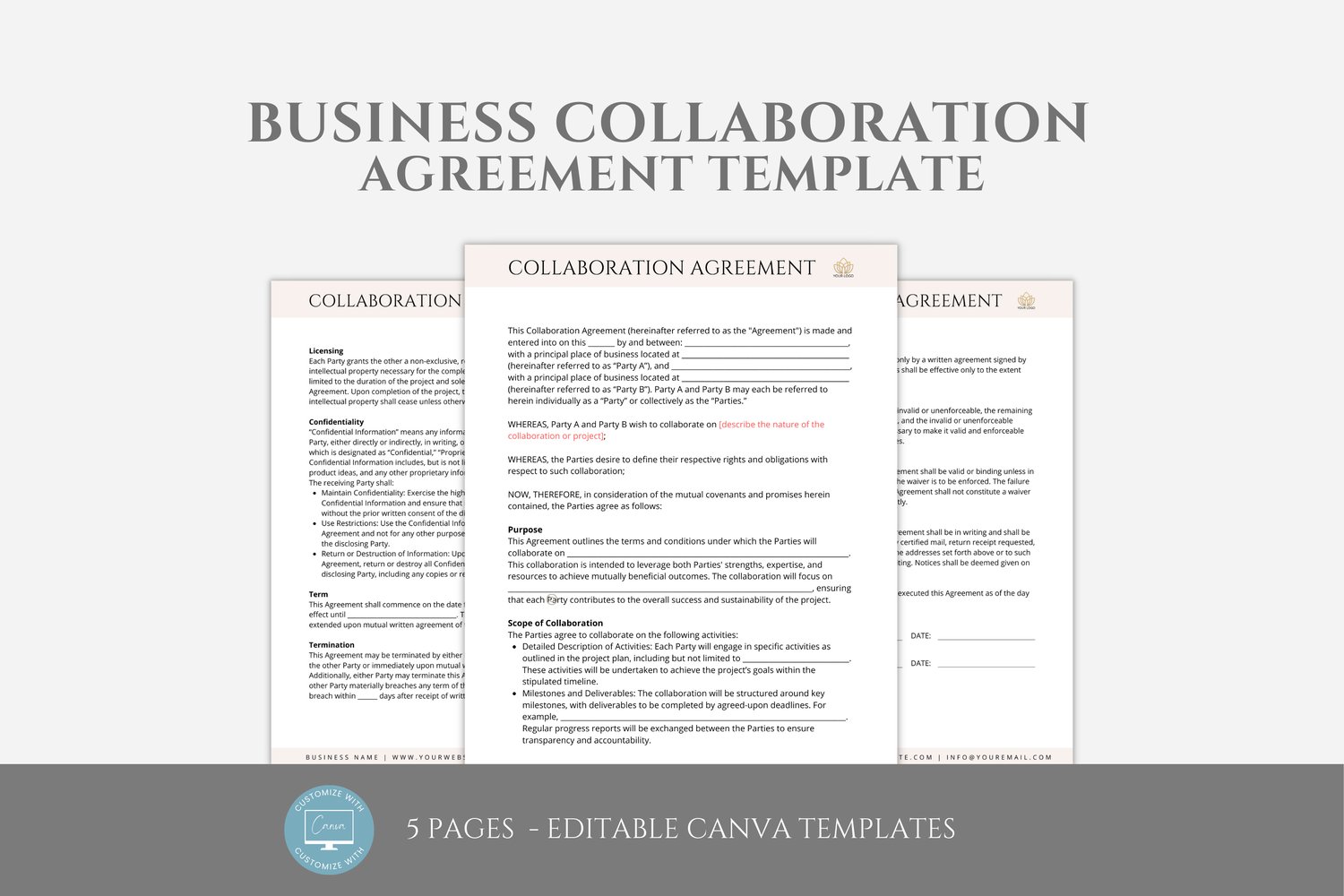 This is a 5-page Collaboration Agreement Template editable in Canva (FREE Account)! The text is already written for you, but it can also be easily edited in CANVA to add anything particular to your business or area. It is also completely customizable. Text, font, and colors are all fully editable to give you complete control of your branding and create a cohesive look for your business.