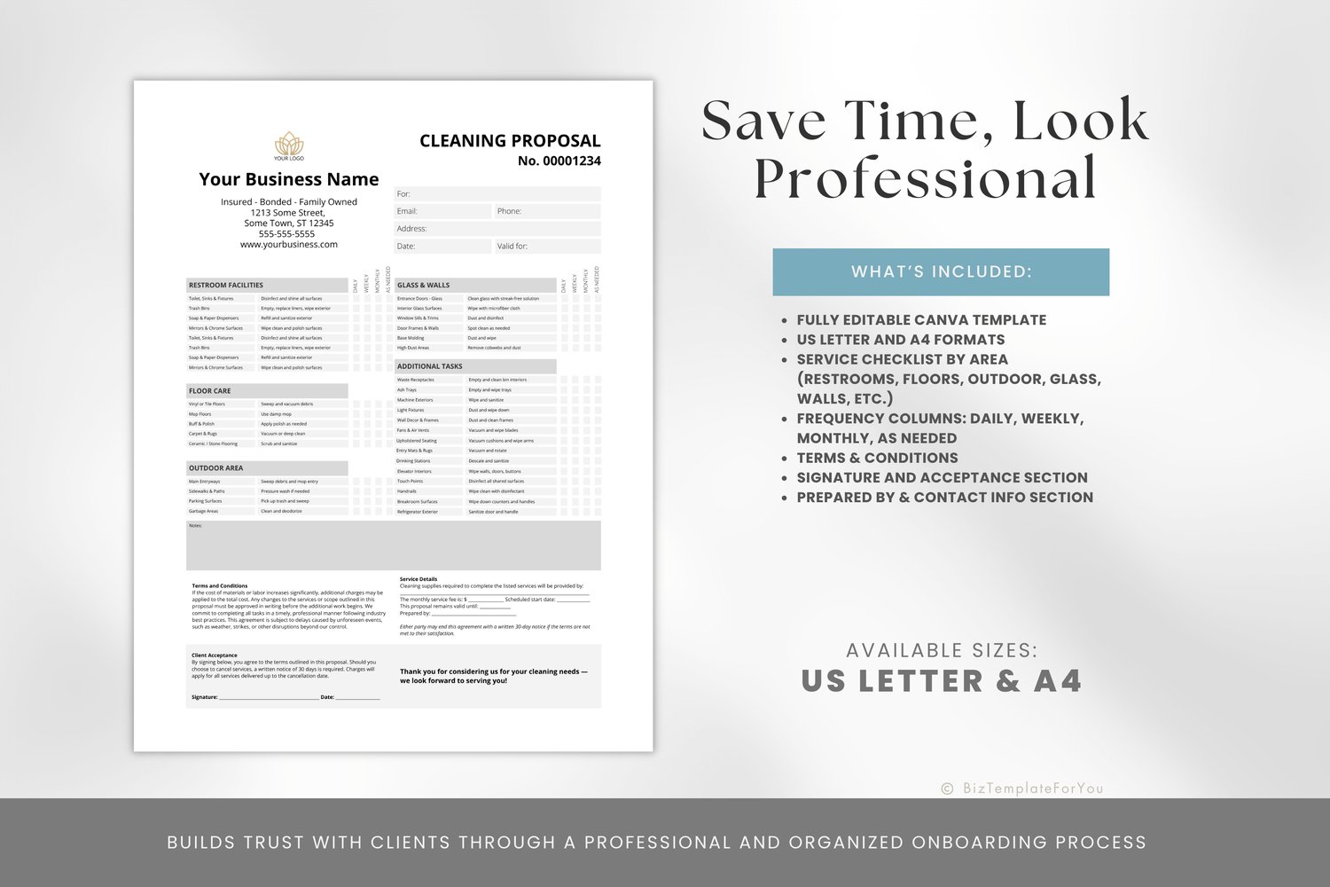 This one-page proposal is a fast and professional way to present your cleaning scope, service frequency, terms, and pricing. Whether you’re bidding for office spaces, retail stores, or property management contracts, this template helps you organize everything clearly and impressively.
