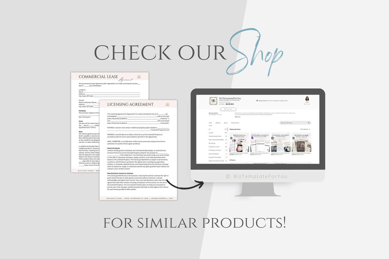 This is a 6-page Commercial License Agreement for Print-On-Demand (POD) Sales Template editable in Canva (FREE Account)! The text is already written for you, but it can also be easily edited in CANVA to add anything particular to your business or area. It is also completely customizable. Text, font, and colors are all fully editable to give you complete control of your branding and create a cohesive look for your business.