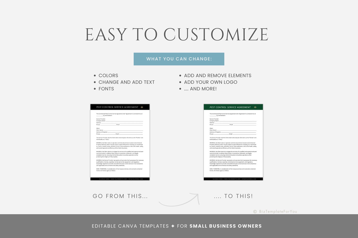 This is a 10-page Commercial Pest Control Contract Template editable in Canva (FREE Account)! The text is already written for you, but it can also be easily edited in CANVA to add anything particular to your business or area. It is also completely customizable. Text, font, and colors are all fully editable to give you complete control of your branding and create a cohesive look for your business.