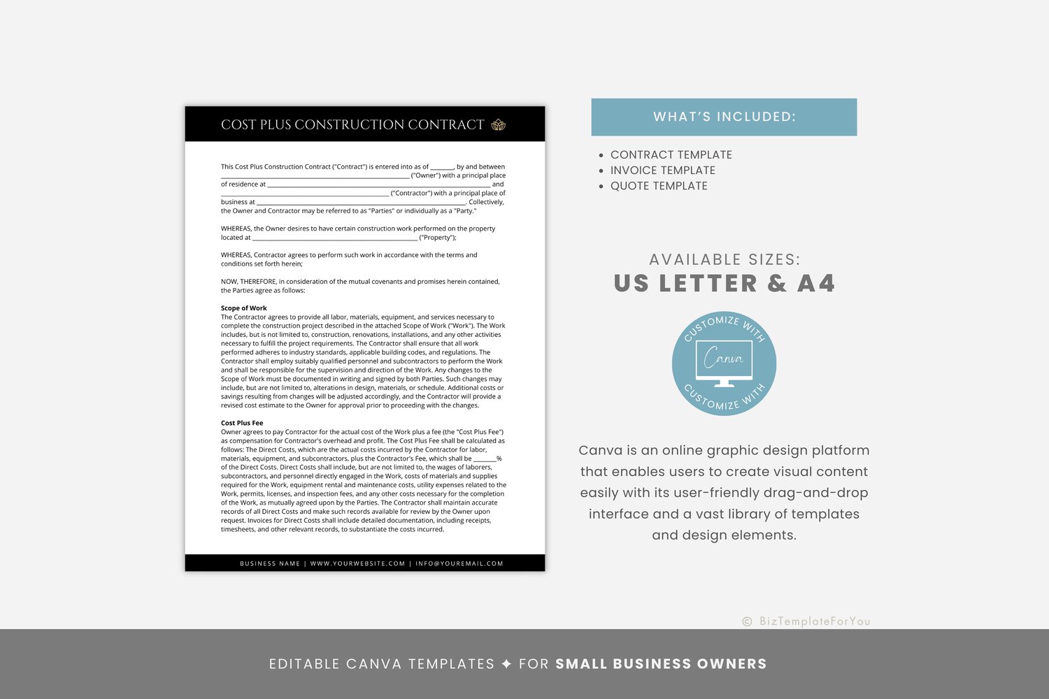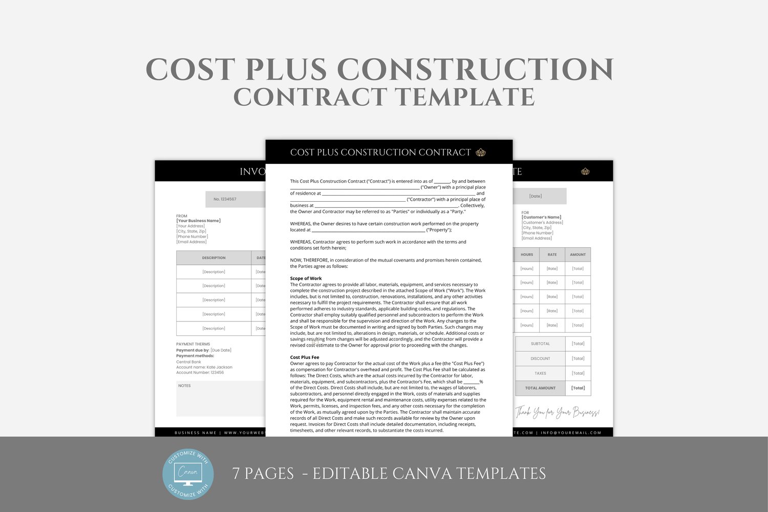 Editable Cost Plus Construction Contract Template, Construction Services Agreement, Residential Construction, Contractor Business, Canva #6093