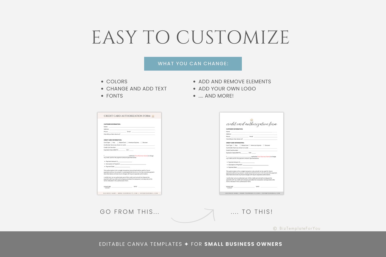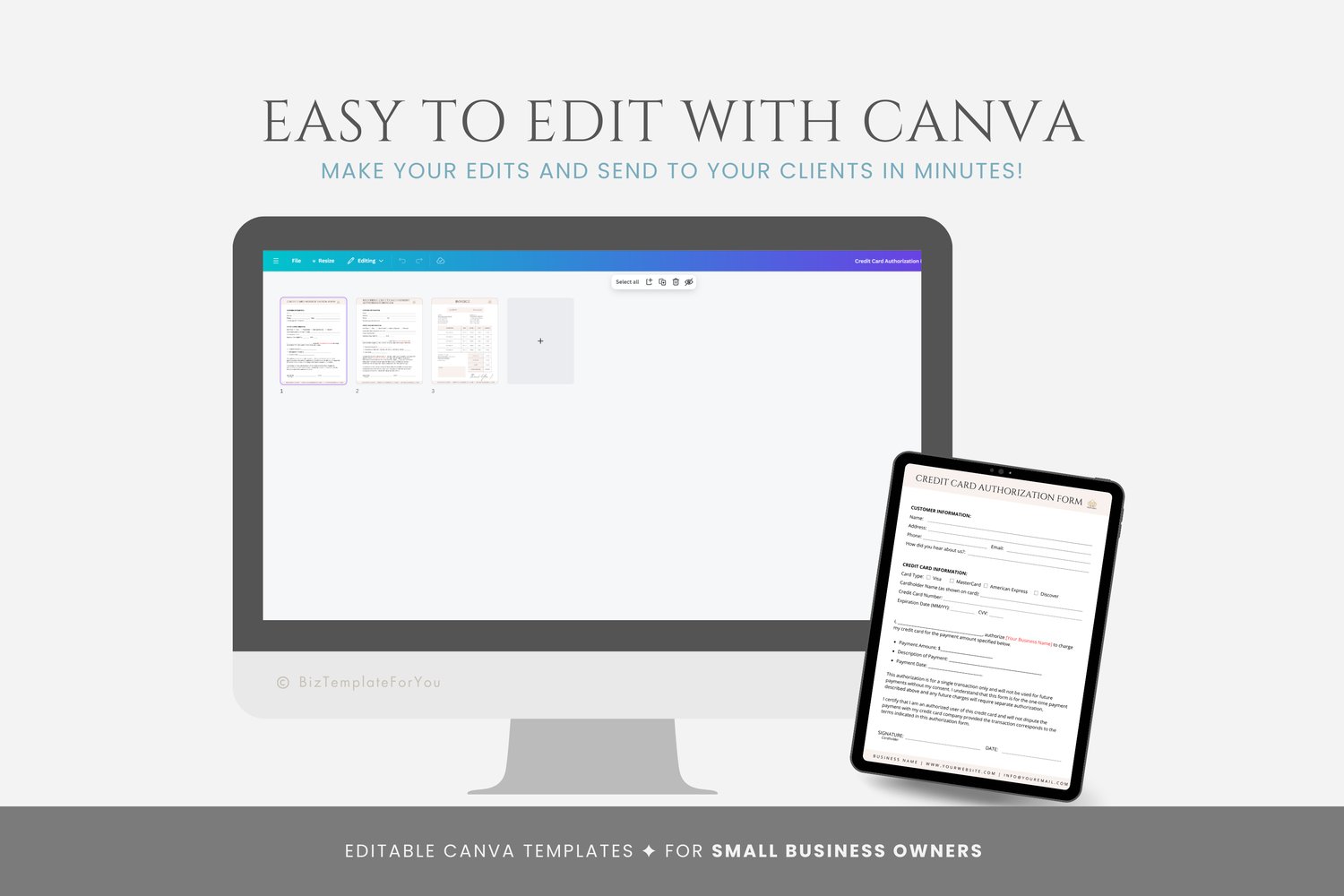 This is a 3-page Credit Card Authorization Form Template editable in Canva (FREE Account)! The text is already written for you, but it can also be easily edited in CANVA to add anything particular to your business or area. It is also completely customizable. Text, font, and colors are all fully editable to give you complete control of your branding and create a cohesive look for your business.