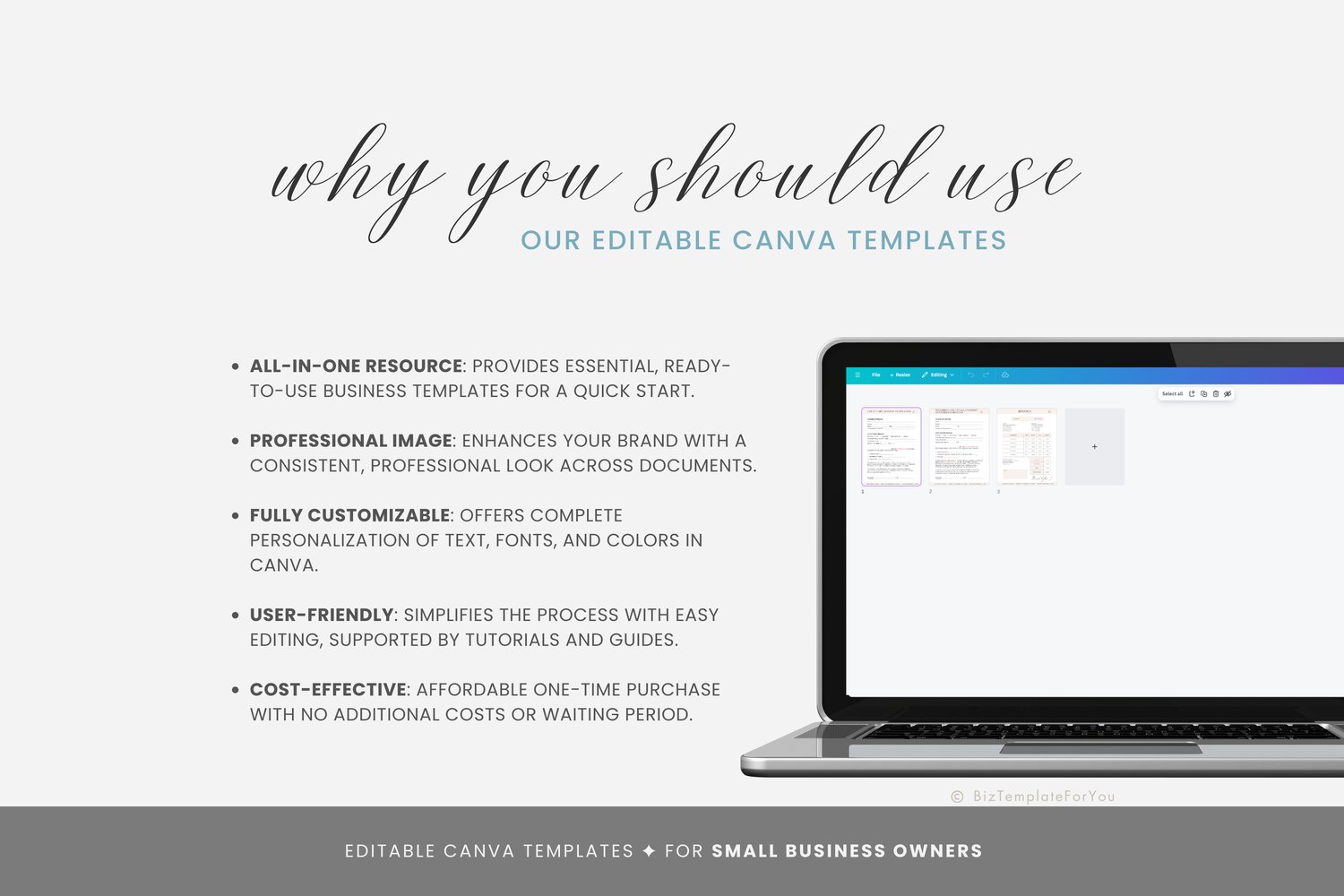 + All elements of our templates are FREE. BizTemplateForYou bears no responsibility for situations wherein the client utilizes PRO elements within Canva, resulting in charges incurred by Canva.