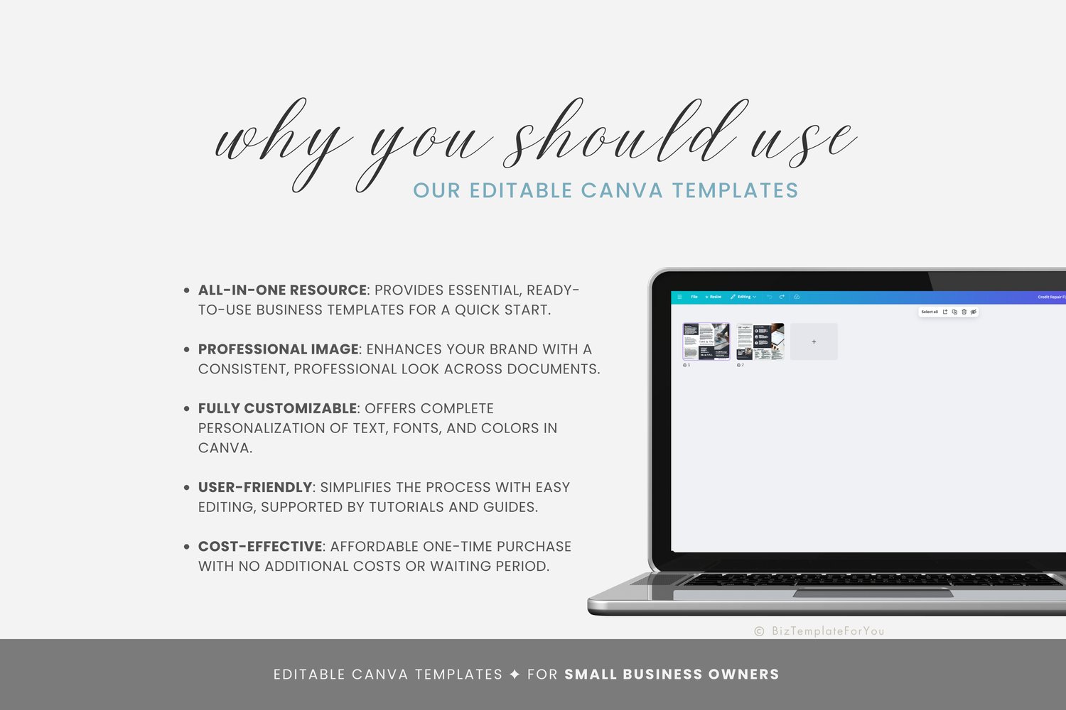 + All elements of our templates are FREE. BizTemplateForYou bears no responsibility for situations wherein the client utilizes PRO elements within Canva, resulting in charges incurred by Canva.