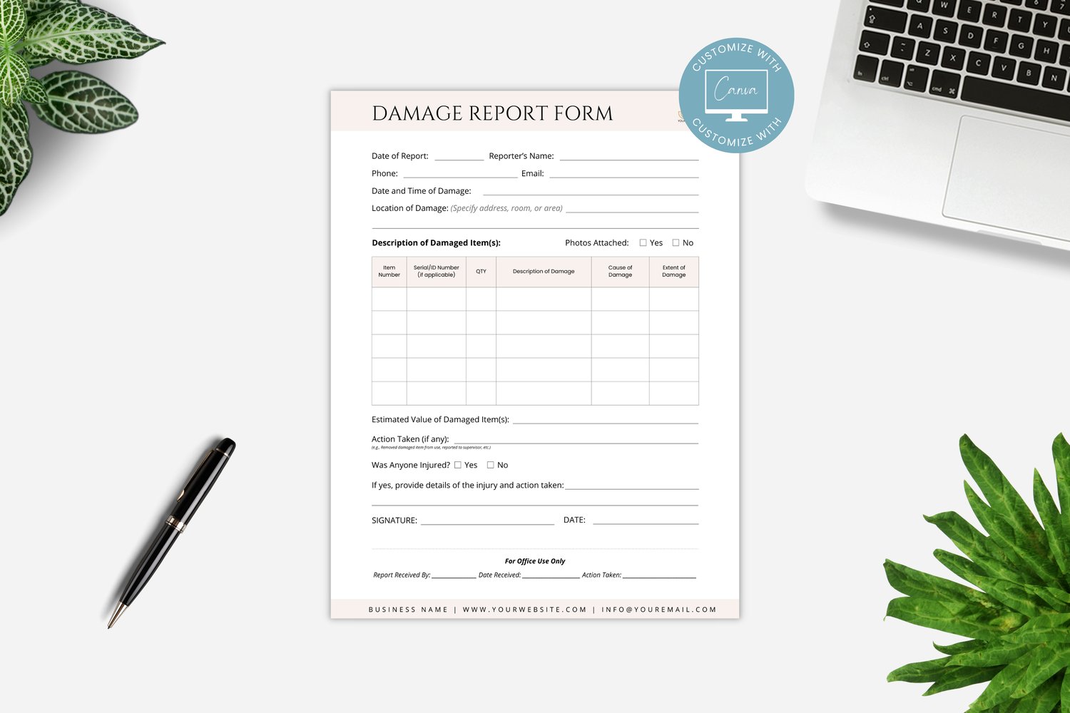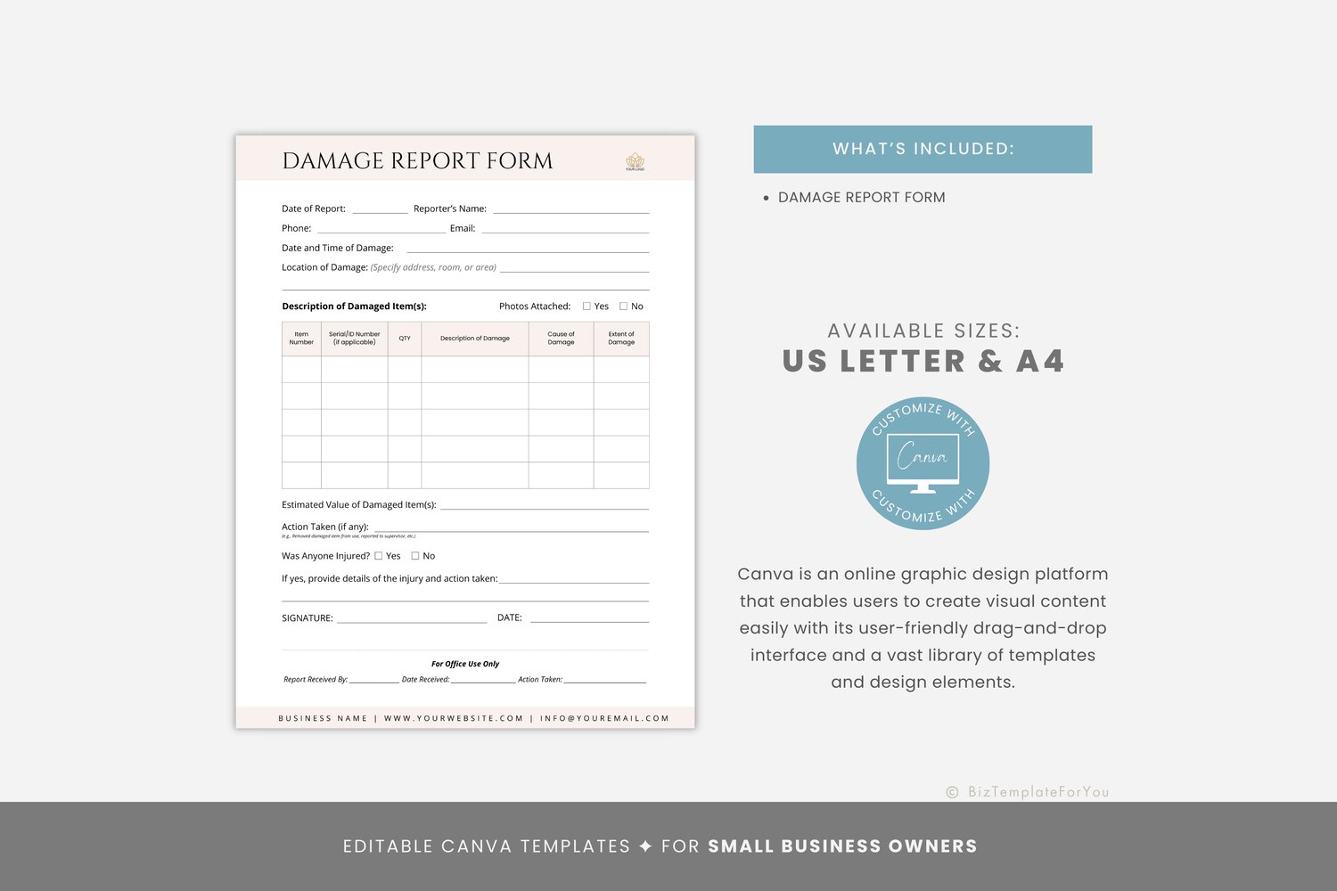 This is a 1-page Damage Report Form Template editable in Canva (FREE Account)! The text has already been written for you, but it can also be easily edited in CANVA to add anything particular to your business or area. It is also completely customizable. Text, font, and colors are all fully editable to give you complete control of your branding and create a cohesive look for your business.