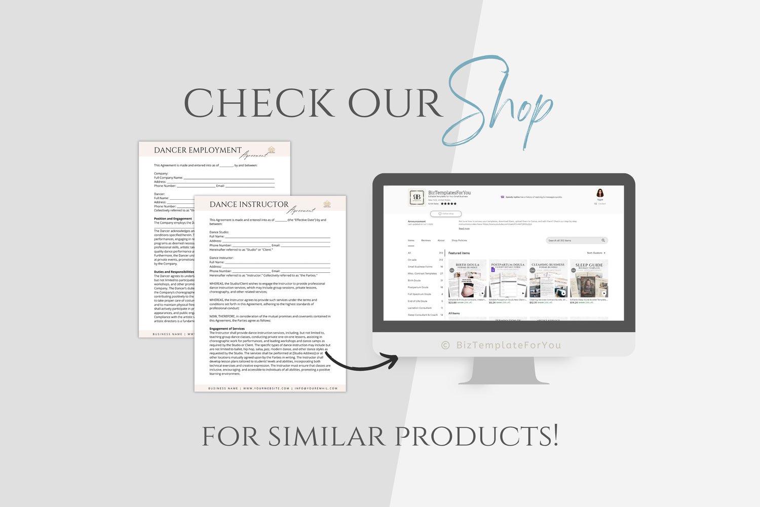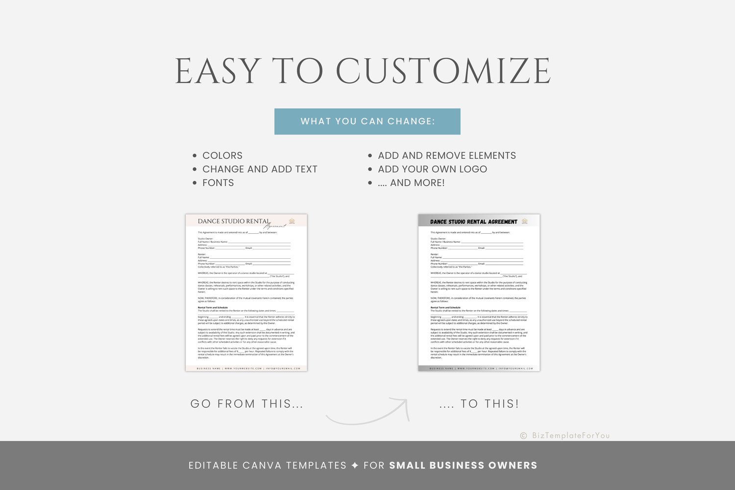 This is a 6-page Dance Studio Rental Agreement Template editable in Canva (FREE Account)! The text is already written for you, but it can also be easily edited in CANVA to add anything particular to your business or area. It is also completely customizable. Text, font, and colors are all fully editable to give you complete control of your branding and create a cohesive look for your business.