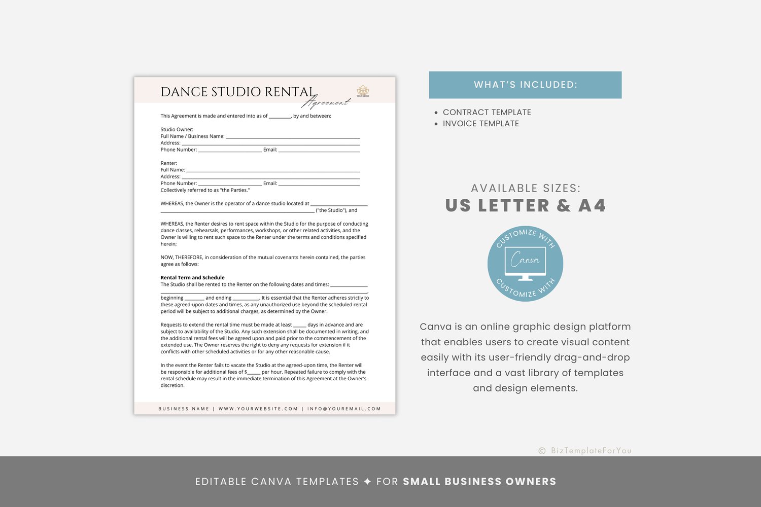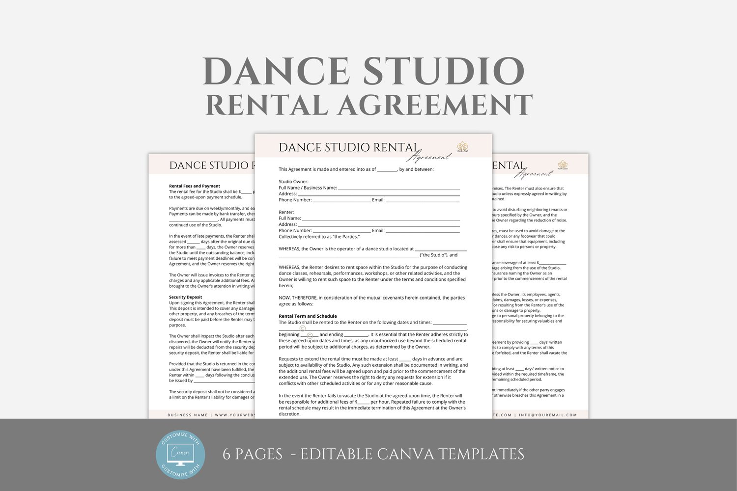 Editable Dance Studio Rental Agreement, Dance School, Dance Business Form, Venue Rental Contract Template, Canva editable #7013