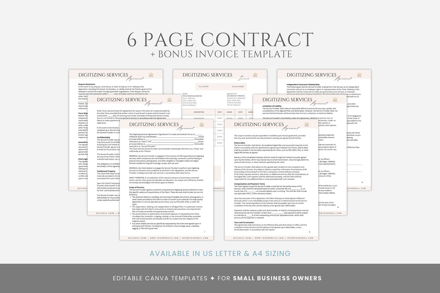 This is a 7-page Digitizing Service Contract Template, editable in Canva (FREE Account)! The text is already written for you, but it is also easily edited in CANVA to add anything that is particular to your business or area. It is also completely customizable. Text, font, and colors are all fully editable to give you complete control of your branding and create a cohesive look for your business.