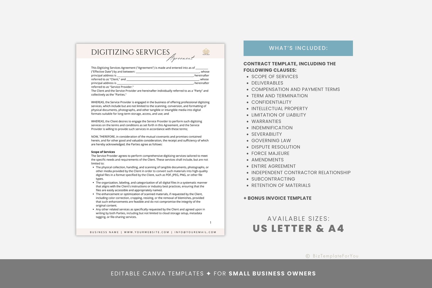 Editable Digitizing Service Contract Template, Custom Digitizing Service Agreement, Professional Digitizing Services Business Forms, Canva editable #7067