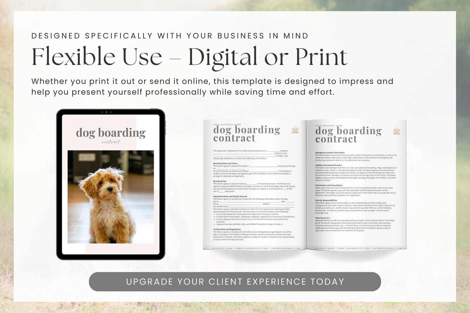Professionally formatted and designed to match your brand in Canva, this contract helps establish trust with pet owners and ensures your operations run smoothly.