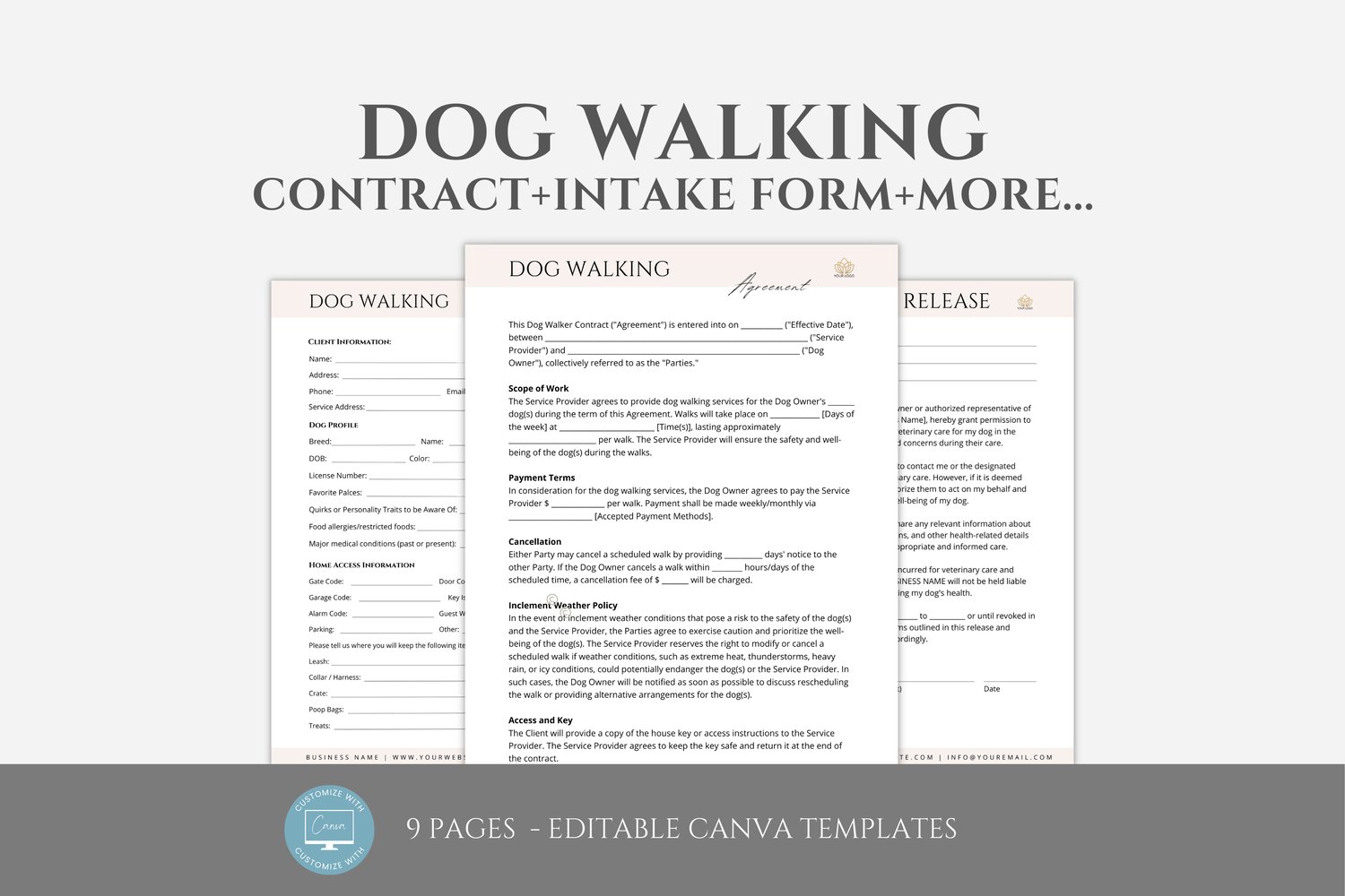 Editable Dog Walking Forms Bundle, Dog Walker Templates, Dog Walking Contract Template, Intake Form, Dog Walker Business, Canva editable #3089