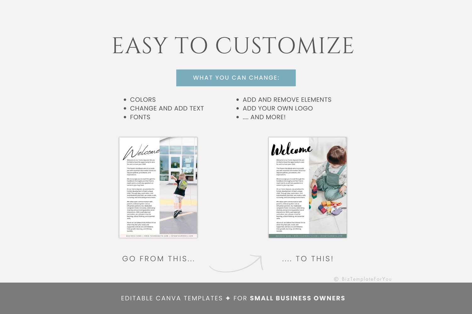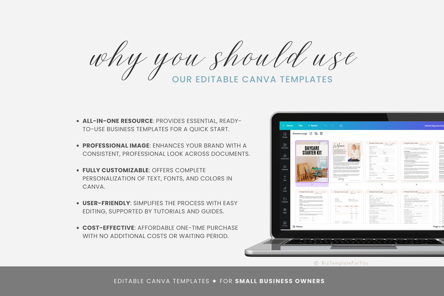 This is a 43-page Daycare Starter Kit—Templates for Daycare Providers editable in Canva (FREE Account)! The text is already written for you, but it is also easily edited in CANVA to add anything particular to your business or area. It is also completely customizable. Text, font, and colors are all fully editable to give you complete control of your branding and create a cohesive look for your business.