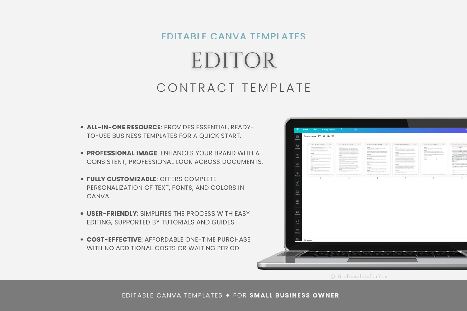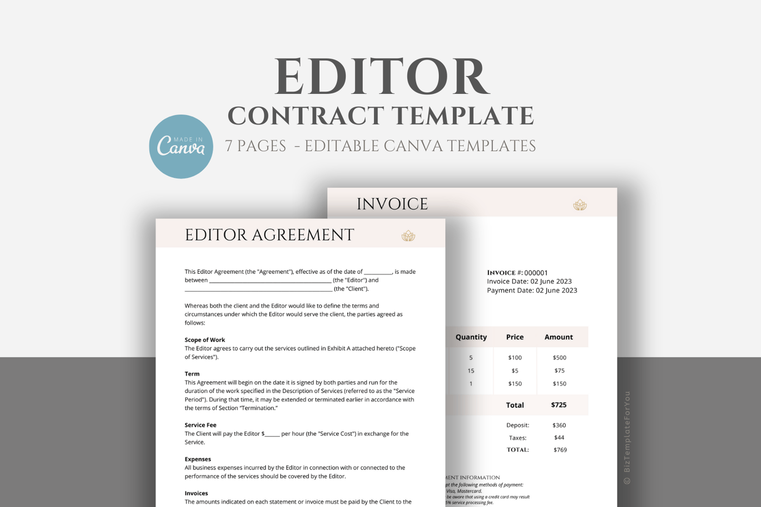 This is a 7-page Editor Contract Template editable in Canva (FREE Account)! The text is already written for you, but it is also easily edited in CANVA to add anything that is particular to your business or area. It is also completely customizable. Text, font, and colors are all fully editable to give you complete control of your branding and create a cohesive look for your business.
