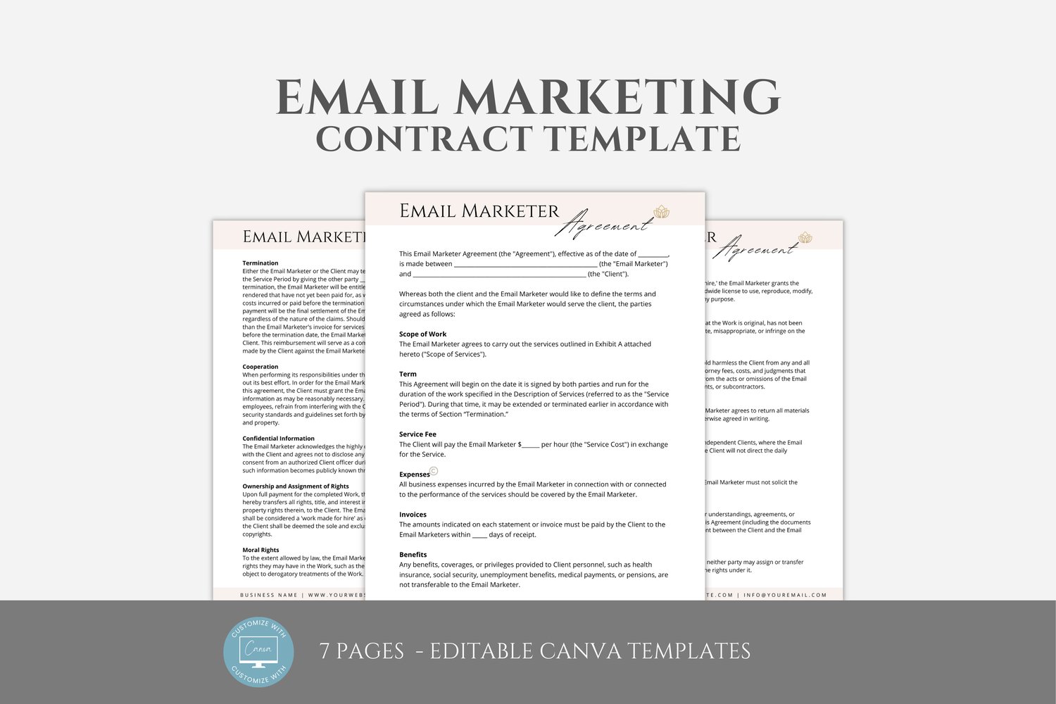 This is a 7-page Email Marketing Contract Template editable in Canva (FREE Account)! The text is already written for you, but it can also be easily edited in CANVA to add anything particular to your business or area. It is also completely customizable. Text, font, and colors are all fully editable to give you complete control of your branding and create a cohesive look for your business.